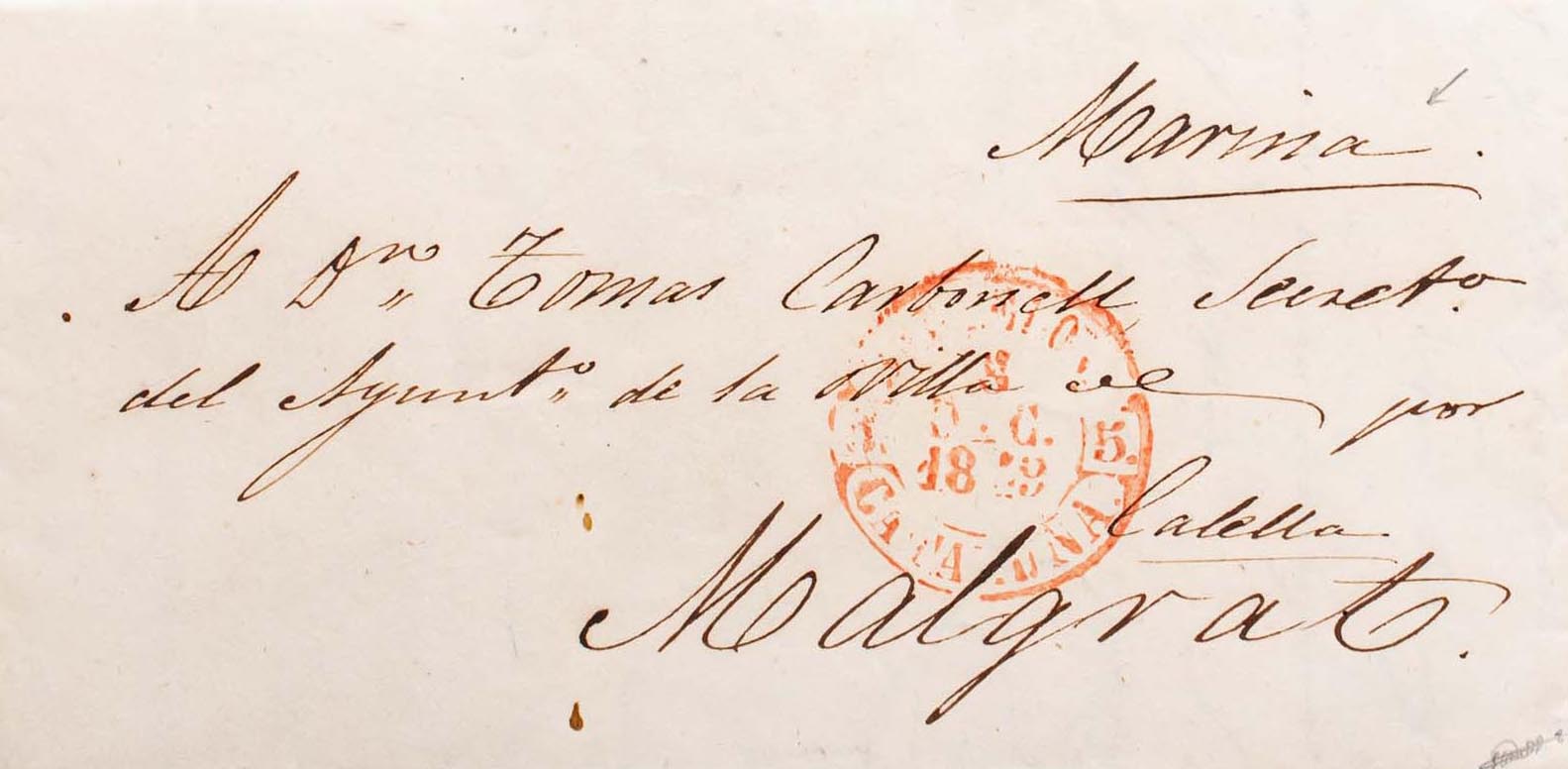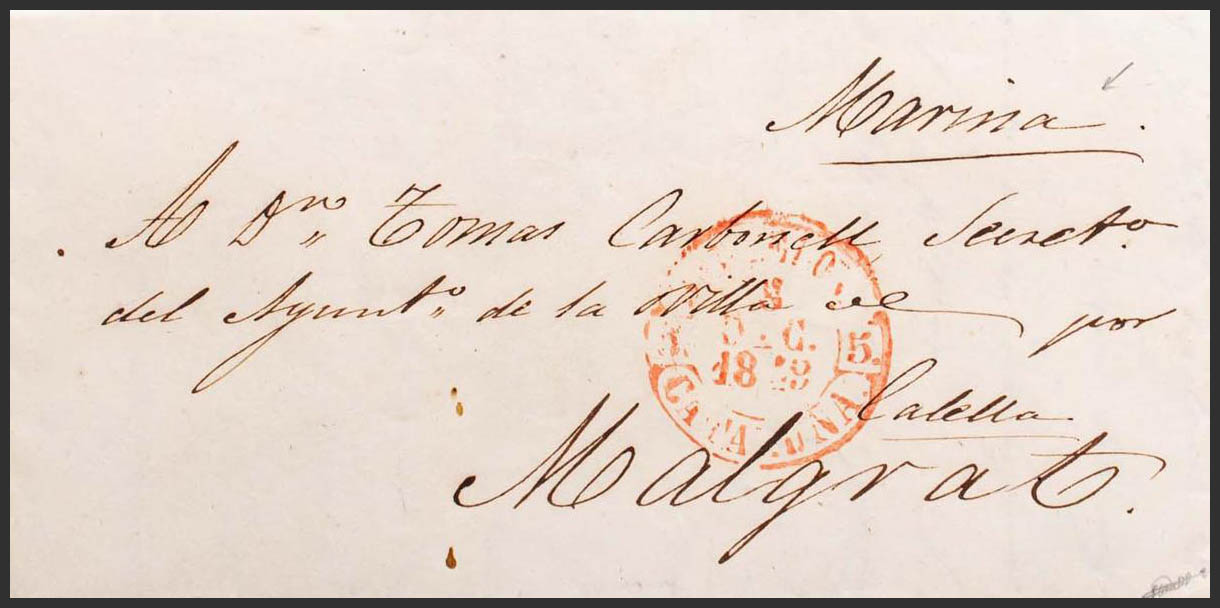 Correo MarÃtimo. BARCELONA a MALGRAT, manuscrito "Marina", indicando la ruta marÃtima. MAGNIFICA.