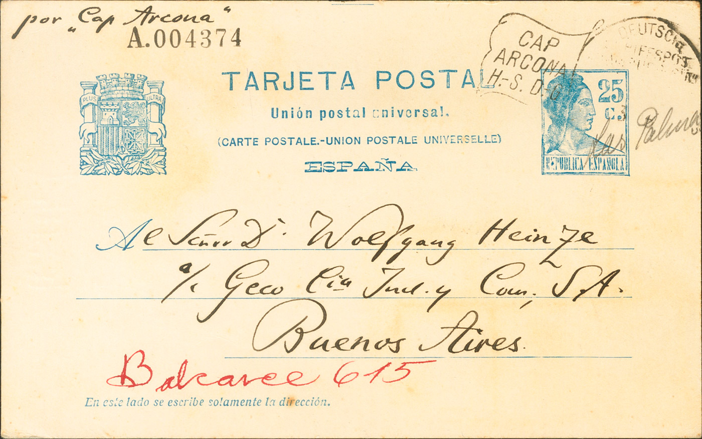 EP71. 1934. 25 cts azul sobre Tarjeta Entero Postal de LAS PALMAS a BUENOS AIRES (ARGENTINA). Matasello "rodillo" CAP / ARCONA / H-S.D.O, aplicado en el buque (perteneciente a la Hamburg Südamerikanische Dampf-Schiffahrts Gesellschaft (Sociedad Hamburguesa-Sudamericana de Navegación a Vapor)). MAGNIFICA Y RARISIMA.