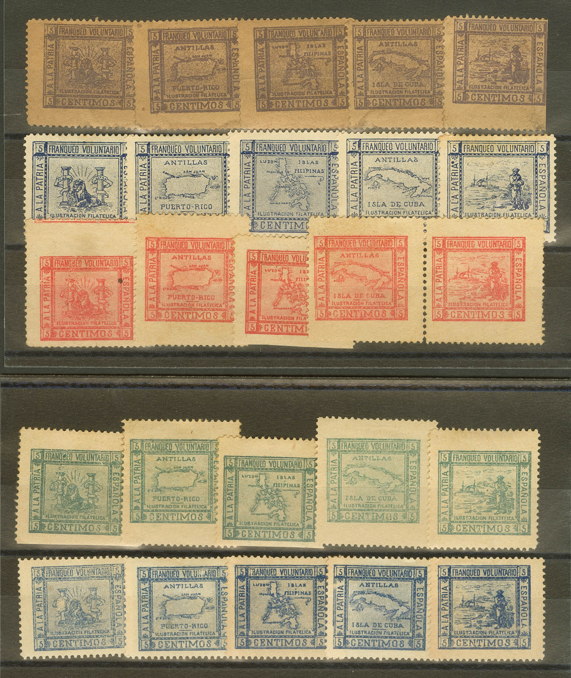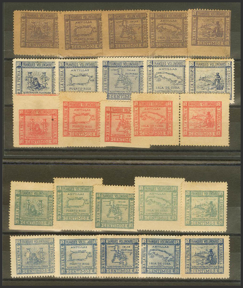 ★/(★)1900. Conjunto de veinticinco viñetas (cinco series de cinco valores) en colores diferentes de 5 cts A LA PATRIA ESPAÑOLA / FRANQUEO VOLUNTARIO, emitidas por la Ilustración Filatélica en favor de la Guerra de 1898. MAGNIFICAS Y RARAS.