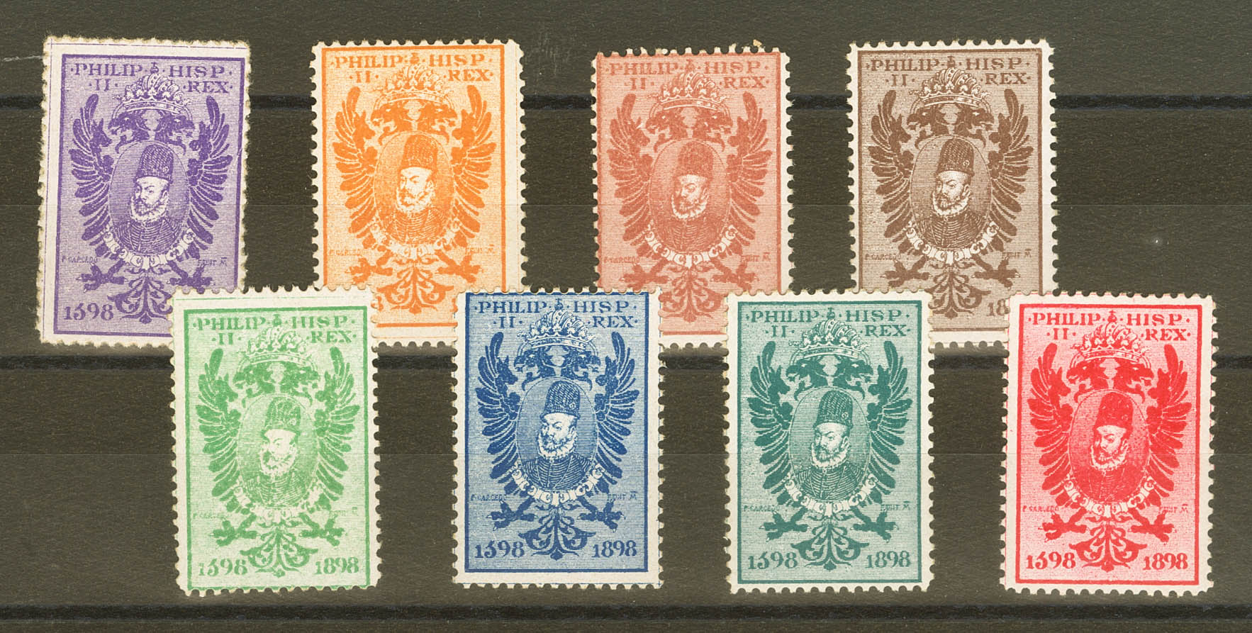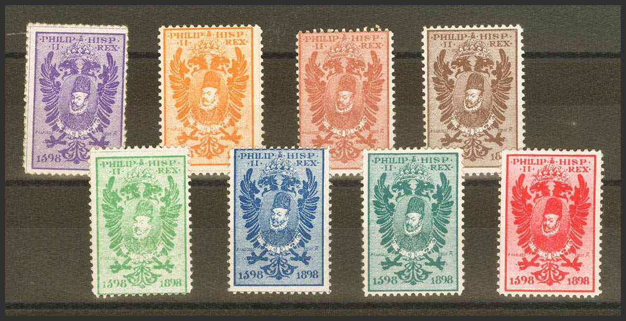 ★1898. Ocho viñetas PHILIP II / HISP.REX / 1598-1898, en colores diferentes. BONITAS Y RARAS.