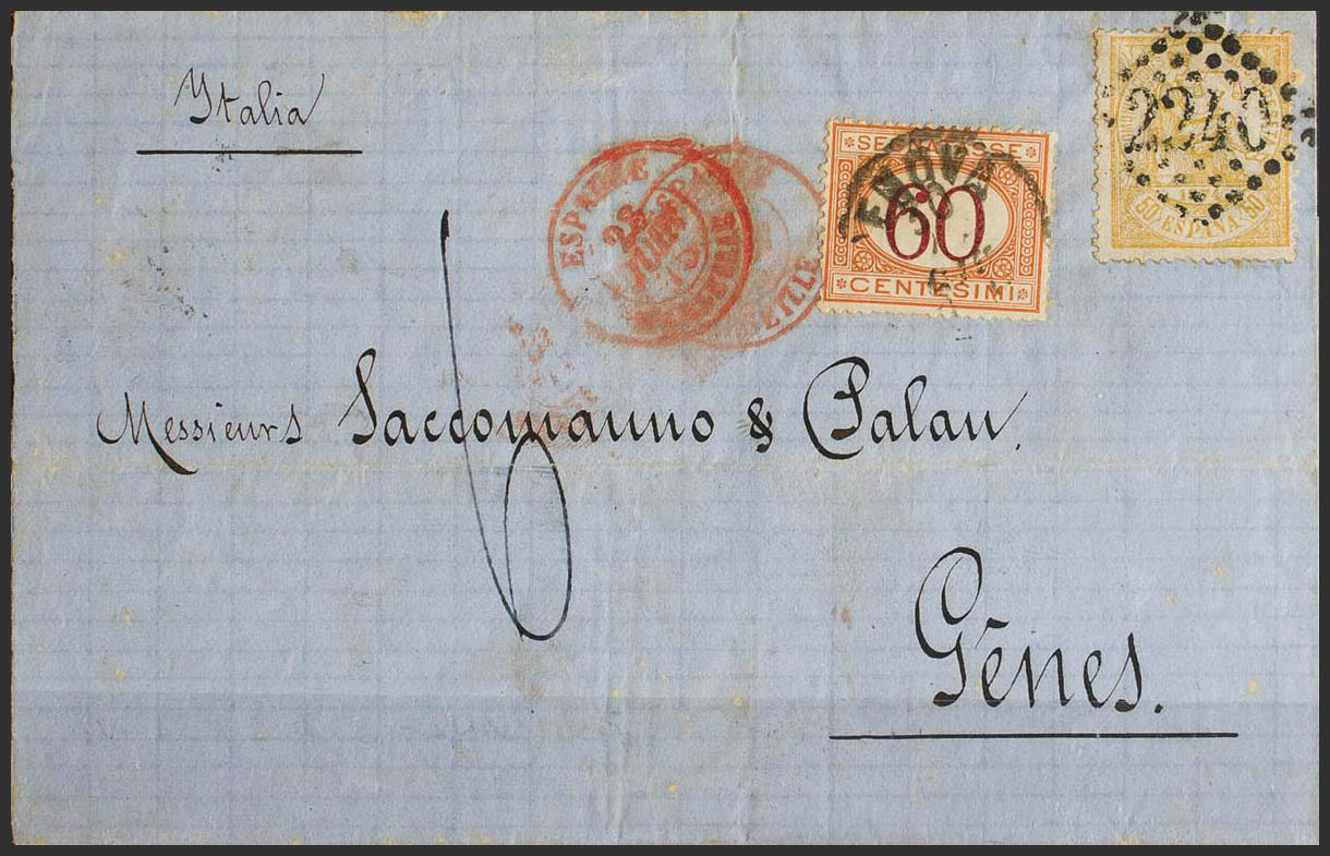 149. 1875. 50 cts amarillo y 60 cts TASA ITALIANA. VALENCIA a GENOVA (ITALIA). Matasello ROMBO CON Nº2240, de Marsella. MAGNIFICA Y RARO FRANQUEO MIXTO ESPAÑA-ITALIA.