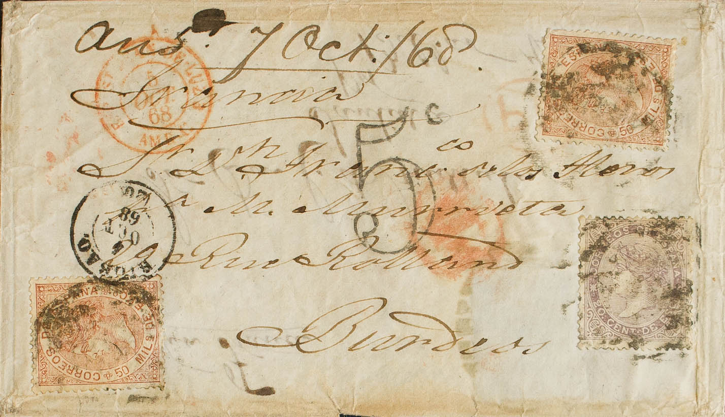 92, 96(2). 1868. 20 cts lila y 50 cts castaño claro, dos sellos. BILBAO a BURDEOS (FRANCIA). MAGNIFICA Y RARISIMA Y ESPECTACULAR COMBINACION DE FRANQUEO PARA COMPLETAR LA TARIFA DE DOBLE PORTE A FRANCIA, ESPECIALMENTE CON EL 20 CTS LILA, ADEMAS LA CARTA ORIGINARIAMENTE PARTIO DE LONDRES Y ESTA FRANQUEADA EN EL OTRO LADO DE LA ENVUELTA CON SELLOS BRITANICOS.