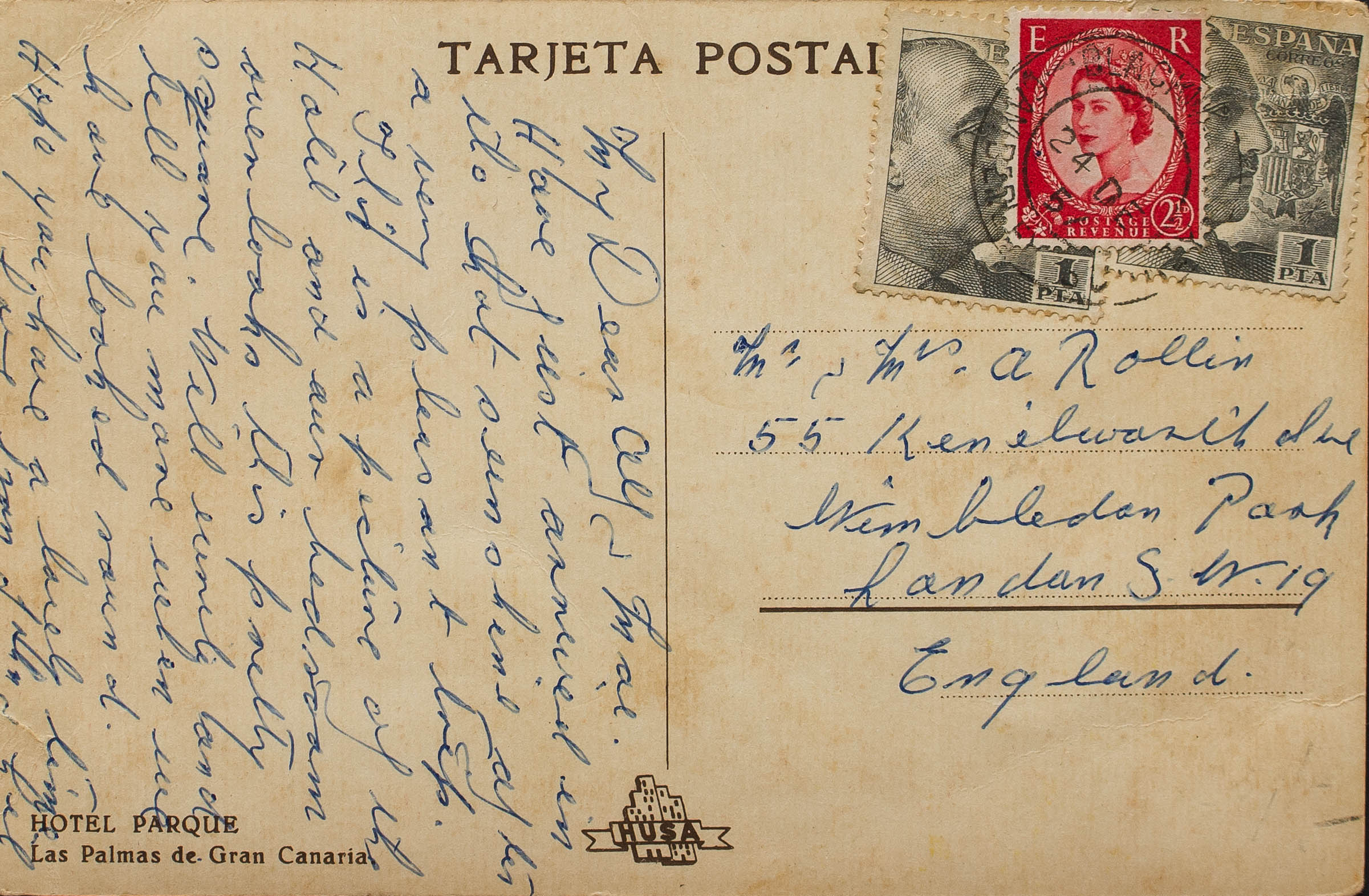 1056(2). 1957. 1 pts negro, dos sellos y sello de Gran Bretaña de 2½ p rojo. Tarjeta Postal de BLACKWATER a LONDRES, posiblemente el remitente tenÃa preparada la tarjeta con el franqueo español pero no la depositó hasta llegar a su población, donde tuvo que franquear la tarjeta con el sello Británico para que pudiera circular en el interior de Gran Bretaña. MAGNIFICA E INUSUAL FRANQUEO.