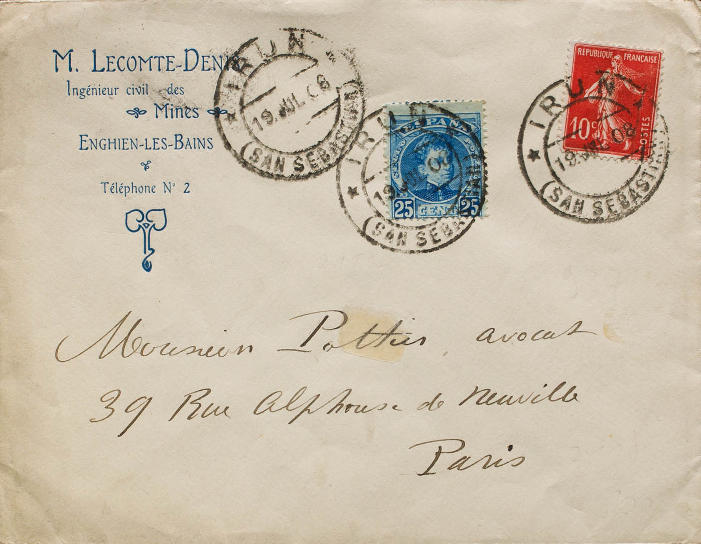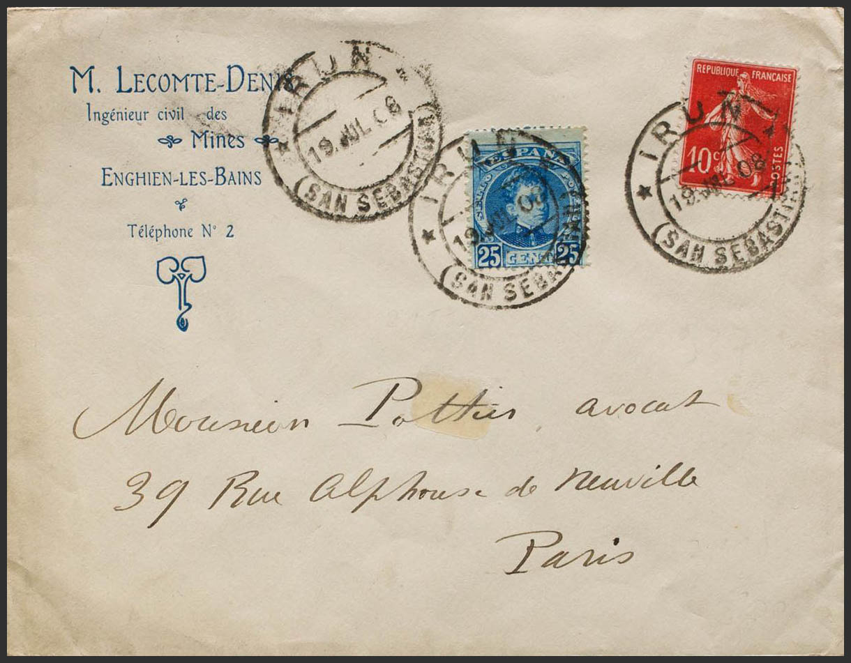 248. 1908. 25 cts azul y 10 cts rojo de Francia. IRUN a PARIS. El remitente aplicó el sello francés para asegurarse que la carta llegara a su destino, al dorso llegada. MAGNIFICA Y RARO FRANQUEO MIXTO.