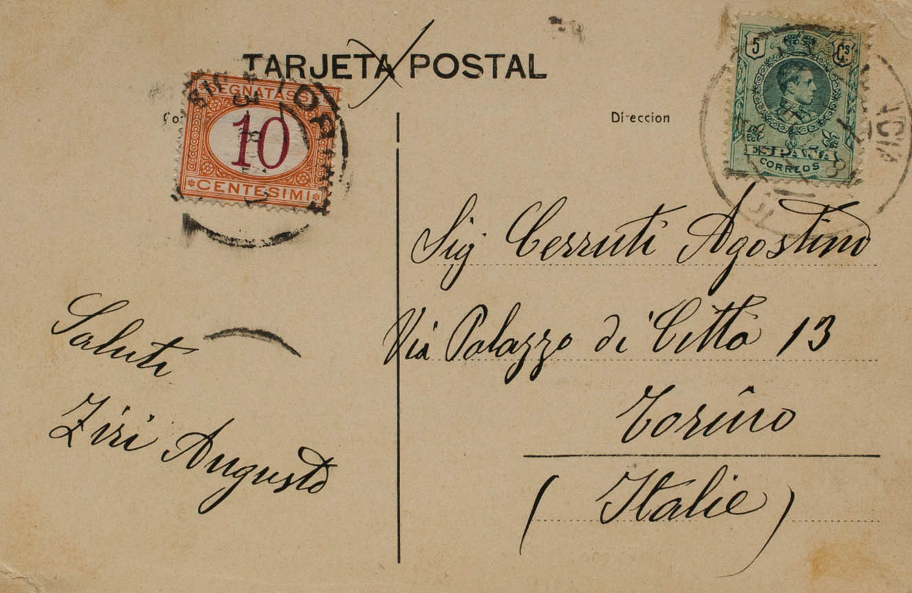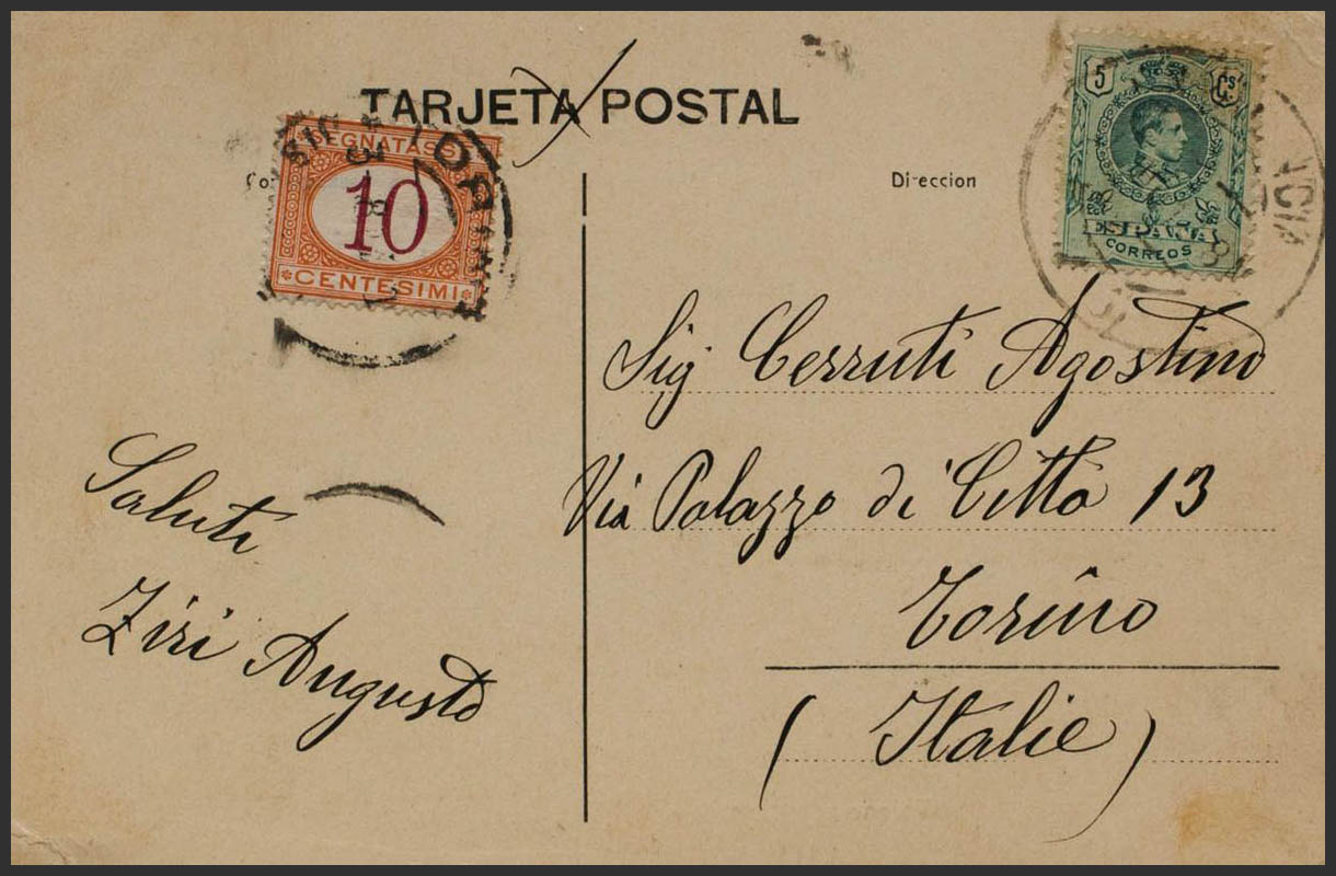 268. 1913. 5 cts verde. Tarjeta Postal de VALENCIA a TURIN (ITALIA). Tasada a la llegada con 10 cts aplicando sello de tasas italiano por el importe debido. MAGNIFICA.