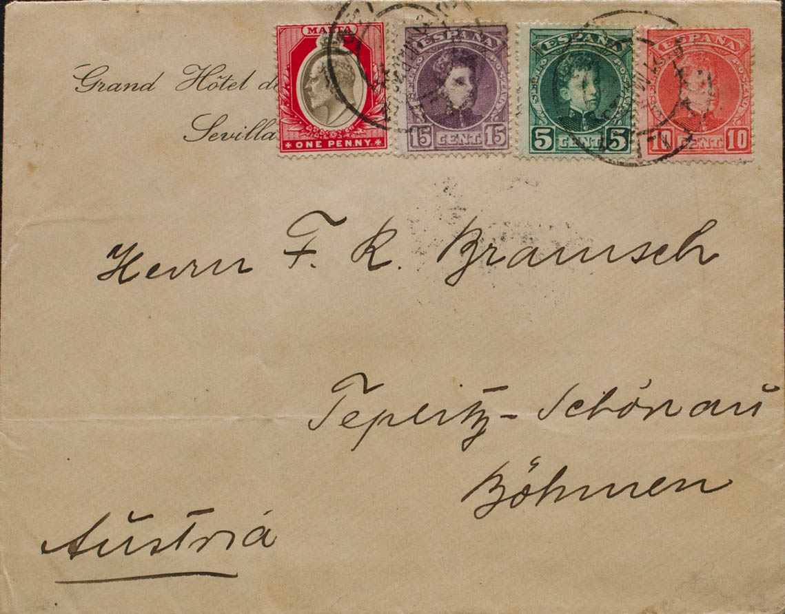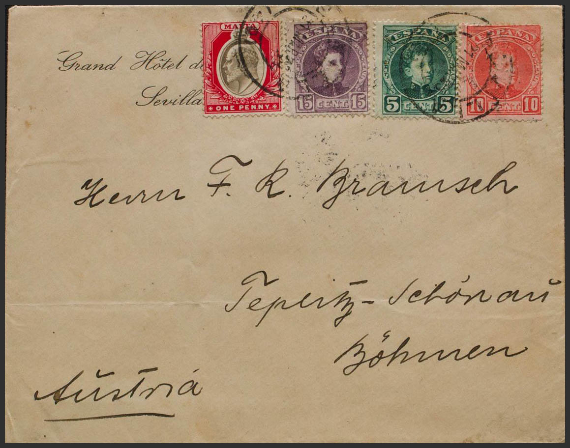 242, 243, 245. 1905. 5 cts verde, 10 cts rojo, 15 cts lila castaño y sello de Malta de 1 p rojo y gris. SEVILLA a TEPLITZ-SCHONAU (BOHEMIA). Al dorso llegada. MAGNIFICO Y RARISIMO FRANQUEO MIXTO FILATELICO EN UNA CARTA VERDADERAMENTE CIRCULADA.