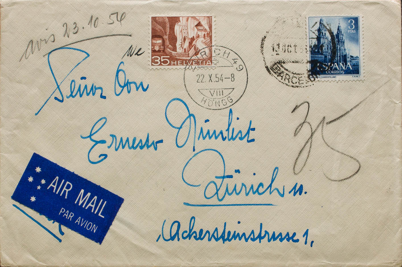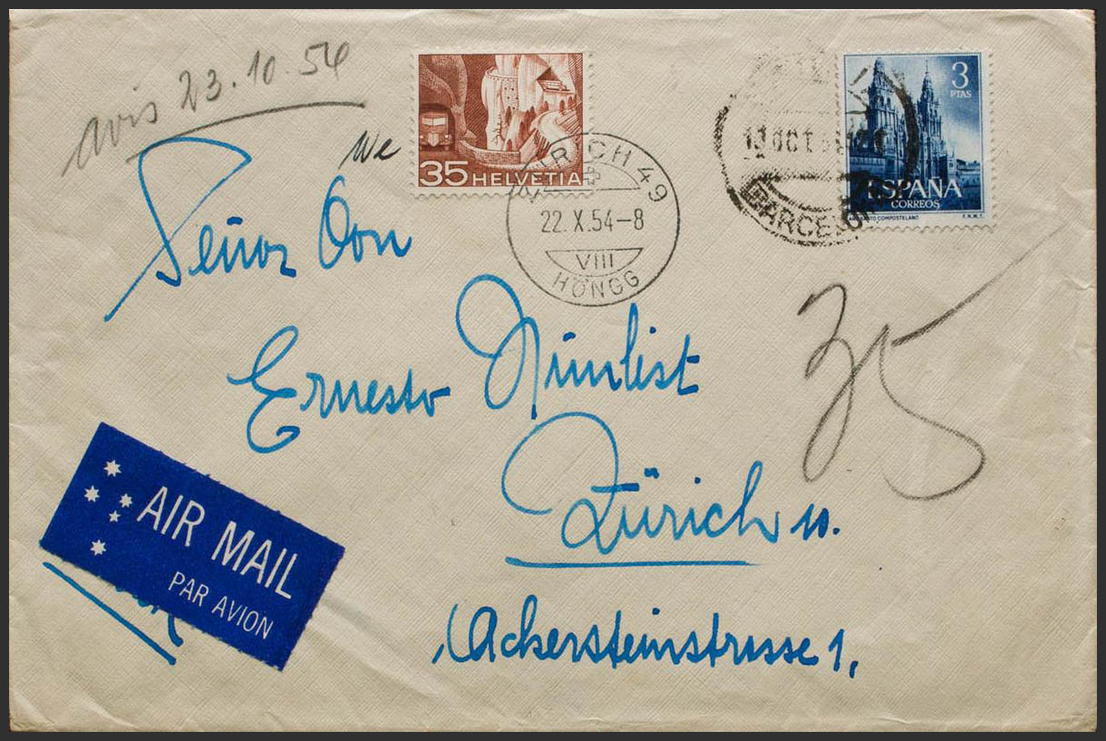 1131. 1954. 3 pts azul. BARCELONA a ZURICH (SUIZA). Tasada a la llegada aplicando sello de Suiza de 35 cts. MAGNIFICA.