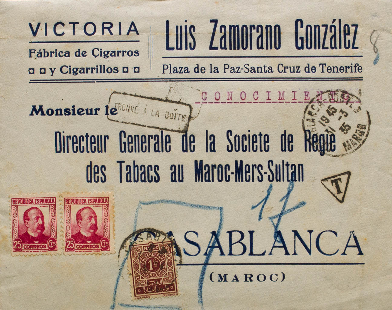 685(2). 1935. 25 cts carmín, dos sellos. SANTA CRUZ DE TENERIFE a CASABLANCA (MARRUECOS FRANCES). Tasada a la llegada, aplicando sello de tasas de 1 fr castaño rojo, en el frente marca TROUVE A LA BOITE. MAGNIFICA.