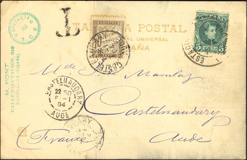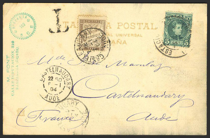 242, Tasa. 1903. 5 cts verde y 10 cts castaño, tasa francesa. Tarjeta de BARCELONA a CASTELNAUDARY (FRANCIA). Matasello ESTACION / (BARCELONA), aplicado el sello de tasa francesa a la llegada. BONITA Y MAGNIFICA.
