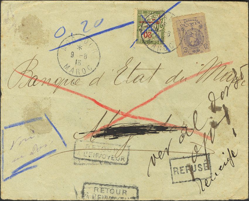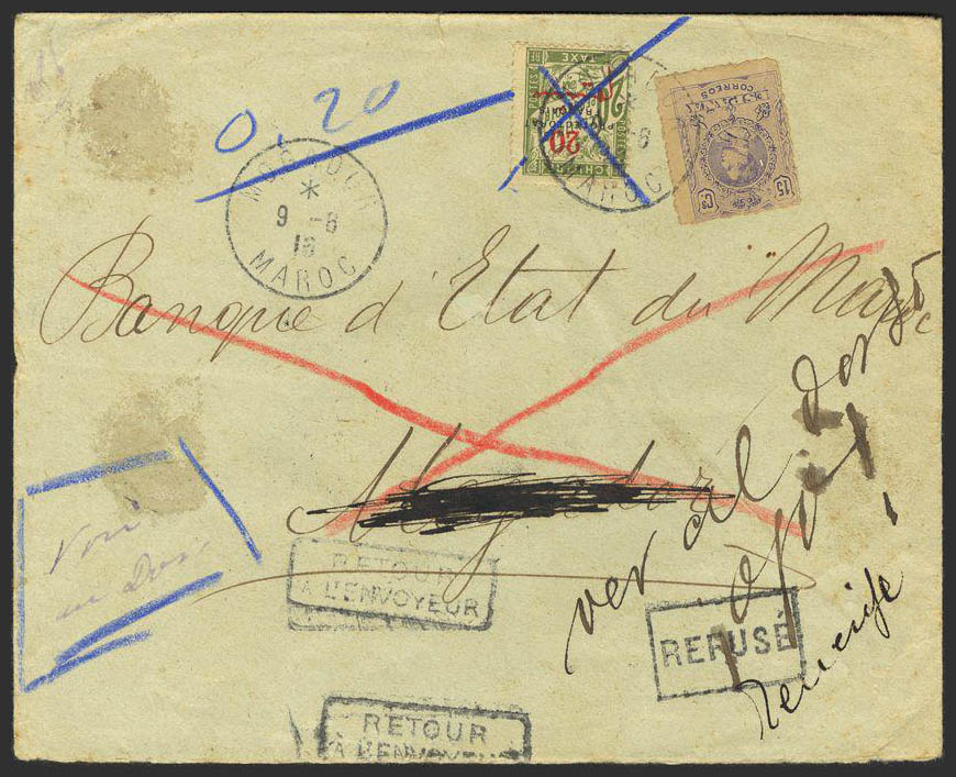 270. 1916. 15 cts. violeta y 20 cts. Tasa de MARRUECOS. TENERIFE a MOGADOR (MARRUECOS) y reexpedida al remitente. MAGNIFICO Y RARISIMO FRANQUEO MIXTO.
