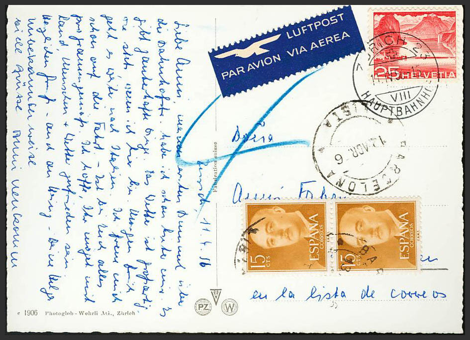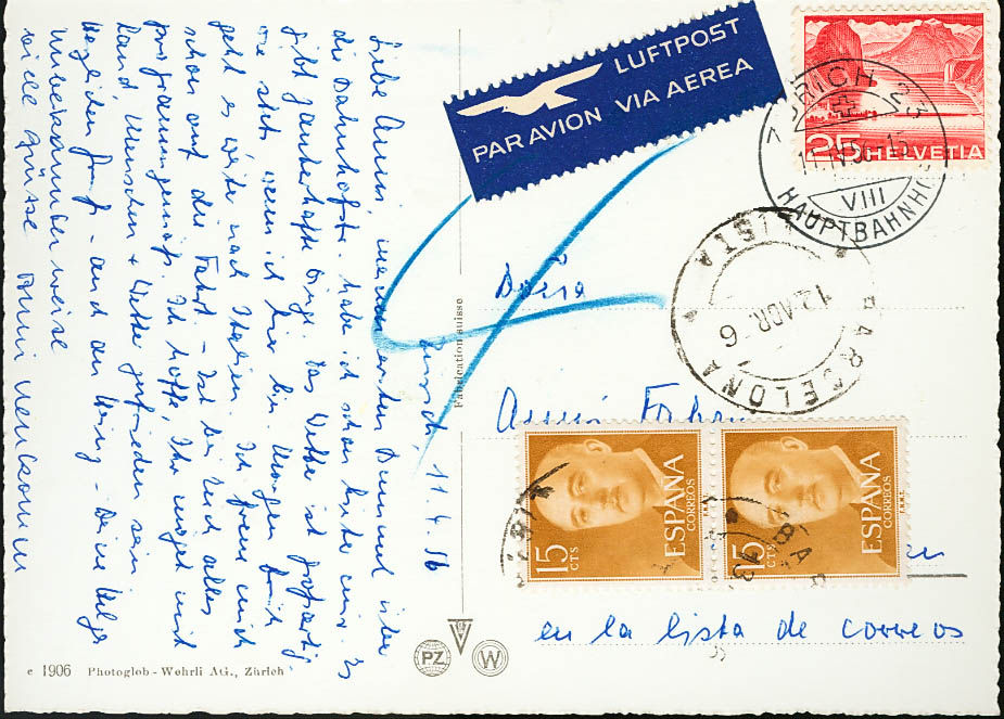 1144(2). 1956. 25 pf rojo. Tarjeta Postal de ZURICH a BARCELONA, dirigido a la Lista de Correos, donde se aplican dos sellos del 15 cts, en concepto del pago por derechos de su uso. MAGNIFICO E INUSUAL FRANQUEO.