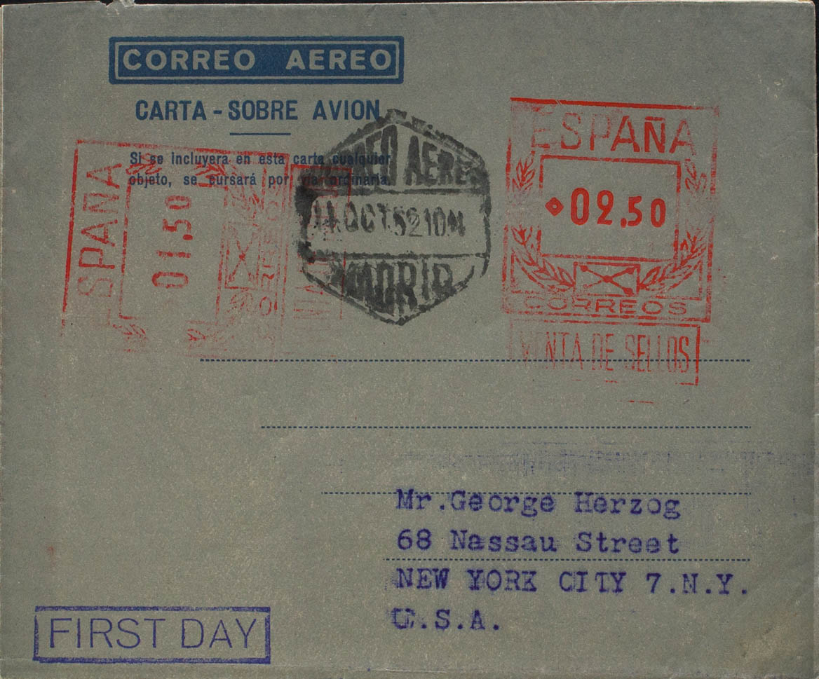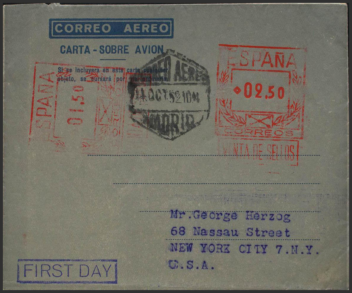 AE31. 1952. 2´50 pts + 1´50 pts sobre aerograma con franqueo doble. MADRID a NUEVA YORK (U.S.A.). En el frente marca FIRST DAY, en violeta. MAGNIFICO Y RARO. Edifil 2017: 248 Euros