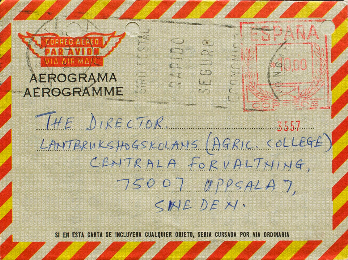 AE112. 1975. 10 pts sobre aerograma (Tipo IV). BADALONA a UPPSALA (SUECIA). MAGNIFICO.