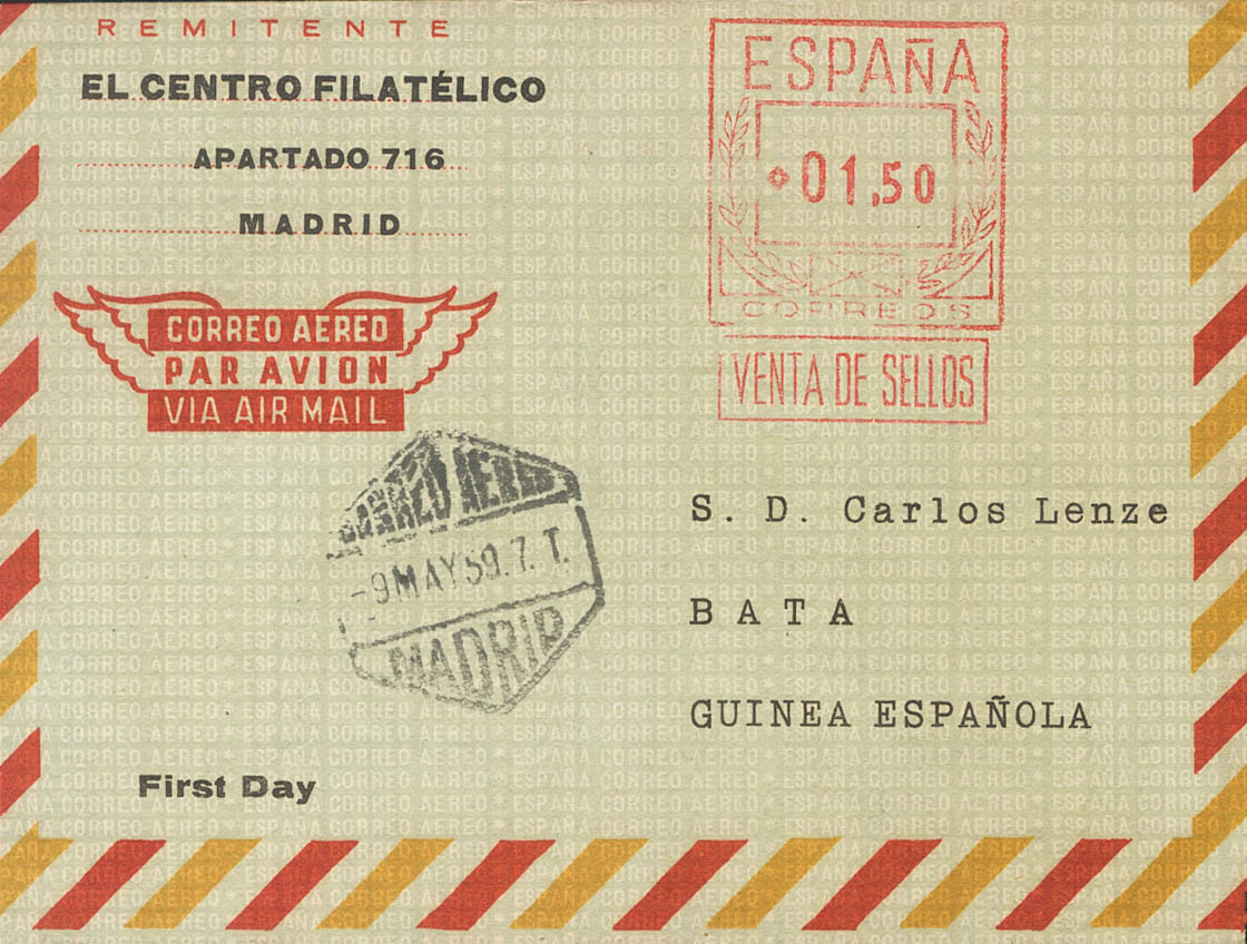 AE72. 1959. 1´50 pts sobre aerograma. MADRID a BATA (GUINEA). Al dorso llegada. MAGNIFICO Y RARO. Edifil 2017: 103 Euros