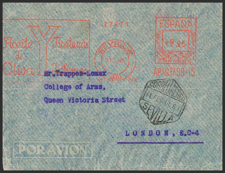 Matasello de Rodillo / Franqueo Mecánico. SEVILLA / YBARRA. MAGNIFICA E INUSUAL POR CORREO AEREO.