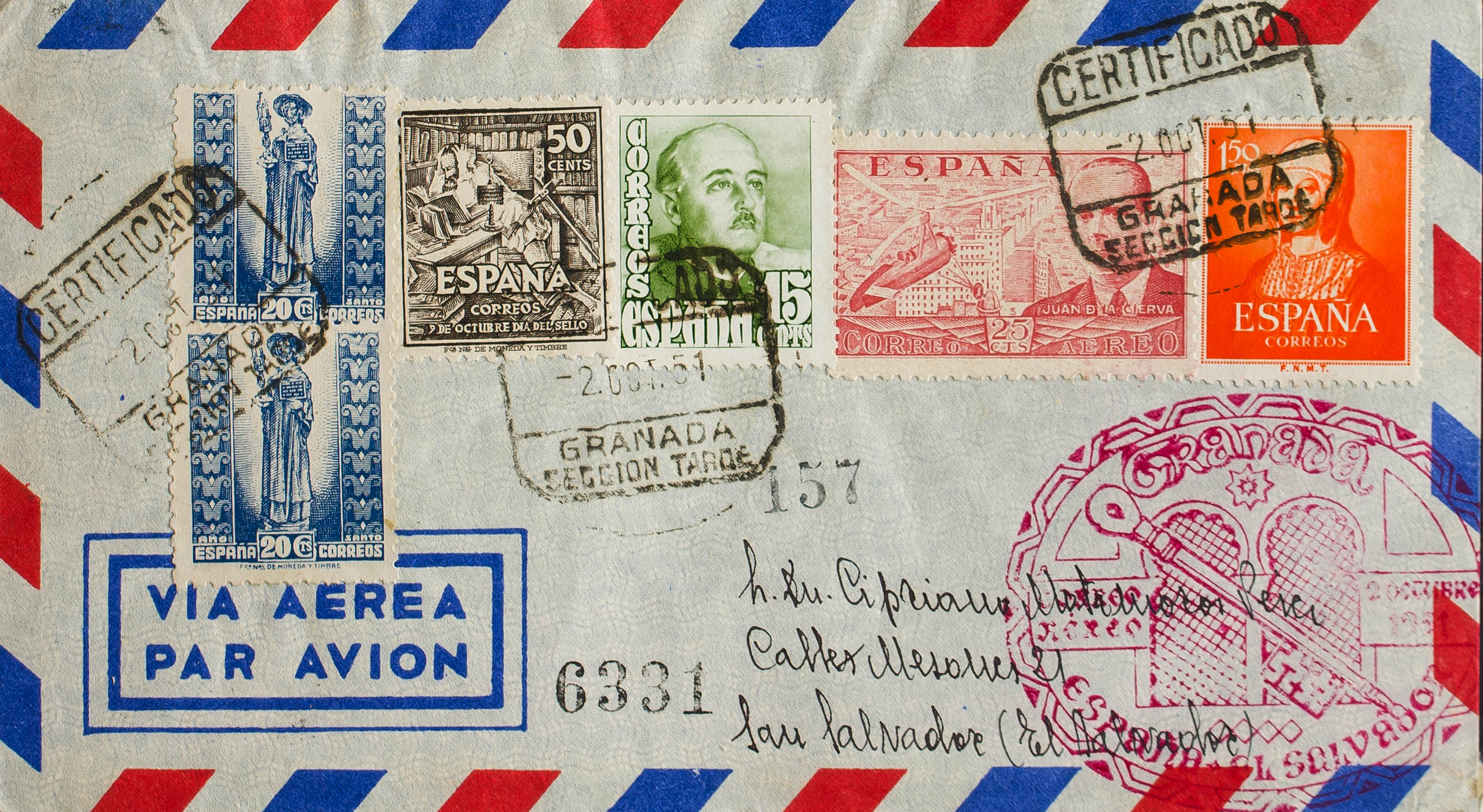 1095, 961(2), 941, 1012, 1021. 1951. 1´50 pts naranja y diversos valores. Certificado de GRANADA a SAN SALVADOR. Al dorso llegada. MAGNIFICA E INUSUAL DESTINO.