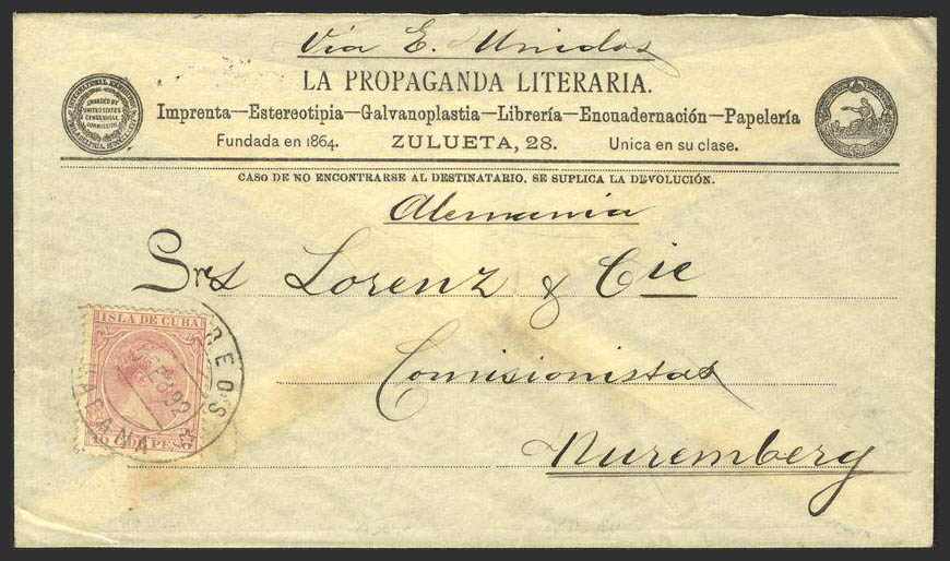 128. 1892. 10 cts. rosa. Sobre propagandÃstico de LA HABANA (CUBA) a NUREMBERG (ALEMANIA). Matasello CORREOS / HABANA. MAGNIFICA.