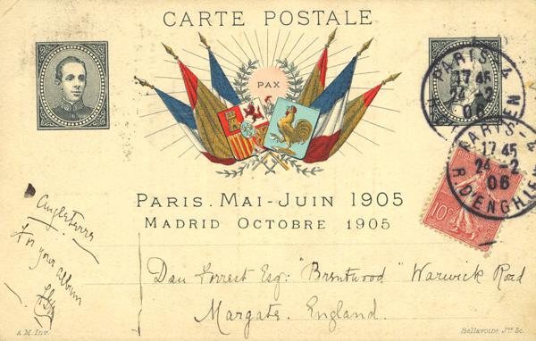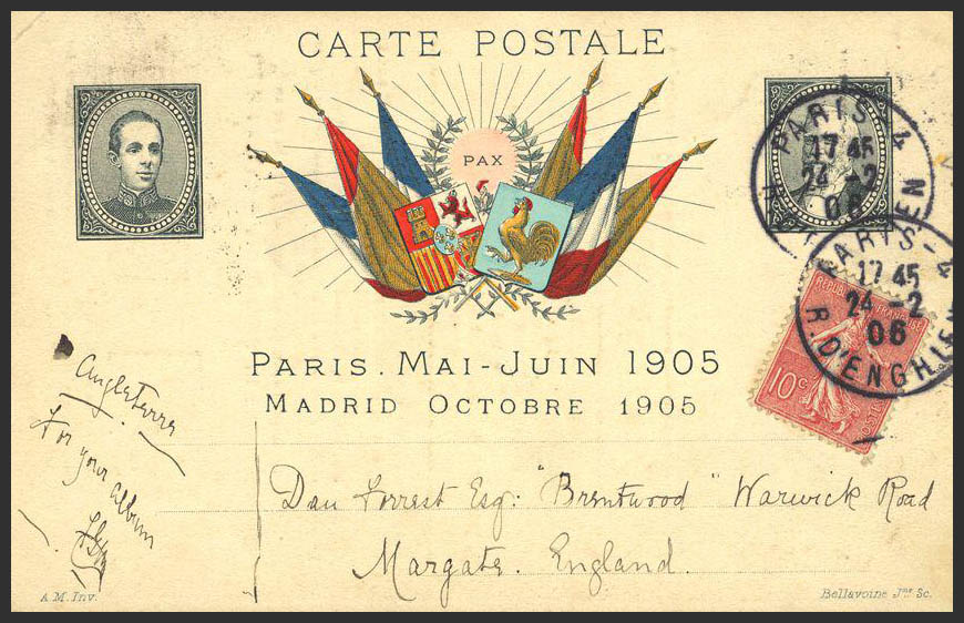 242(3), 243. 1903. 5 cts verde, tres sellos y 10 cts rojo. Espectacular Sobre Ilustrado de SEVILLA a LIBOURNE (FRANCIA). Al dorso llegada. MAGNIFICA E INUSUAL.