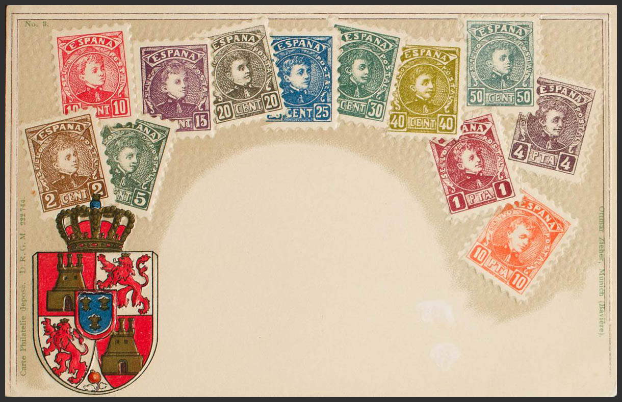 1909. Tarjeta Postal sin circular, con la reproducción de doce valores de la serie del "Cadete". Editada por Ottmar Zieher, Munich. MAGNIFICA.