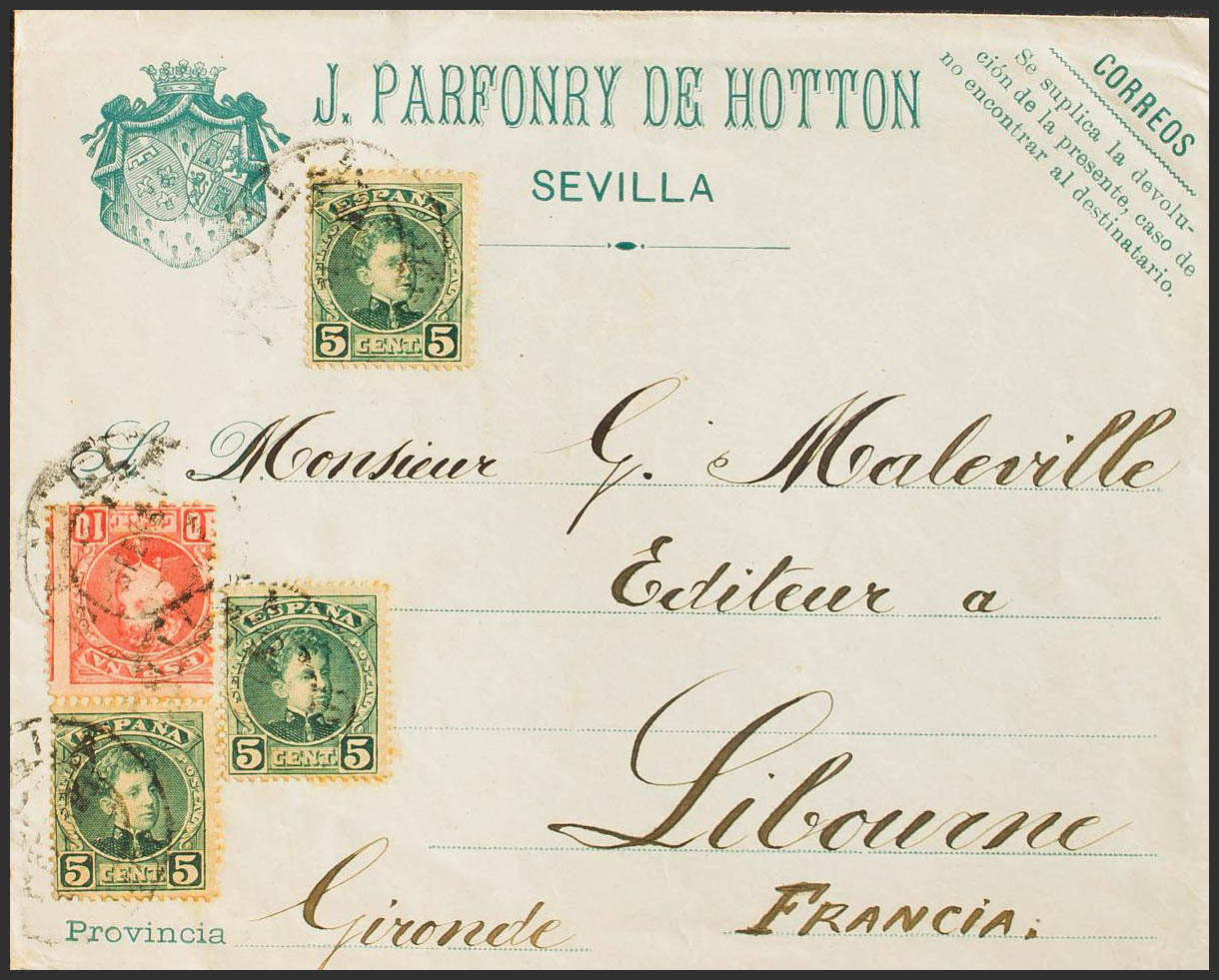 242(3), 243. 1903. 5 cts verde, tres sellos y 10 cts rojo. Espectacular Sobre Ilustrado de SEVILLA a LIBOURNE (FRANCIA). Al dorso llegada. MAGNIFICA E INUSUAL.
