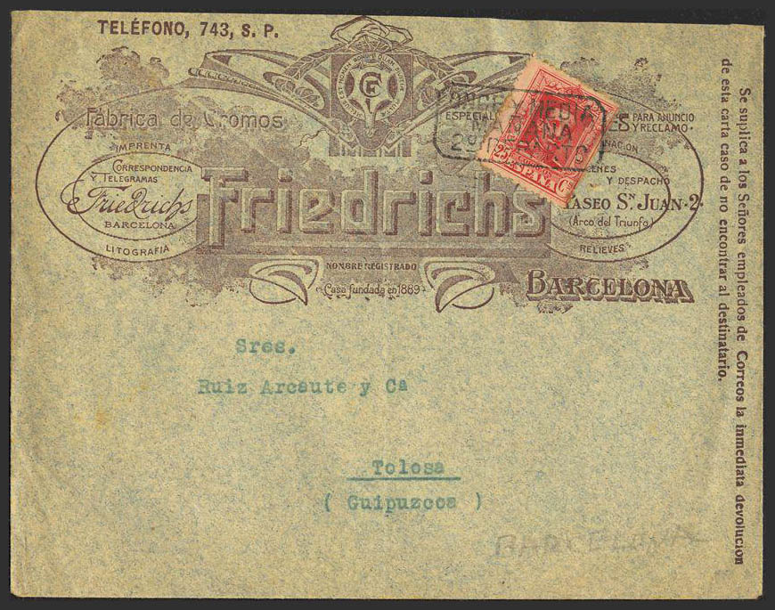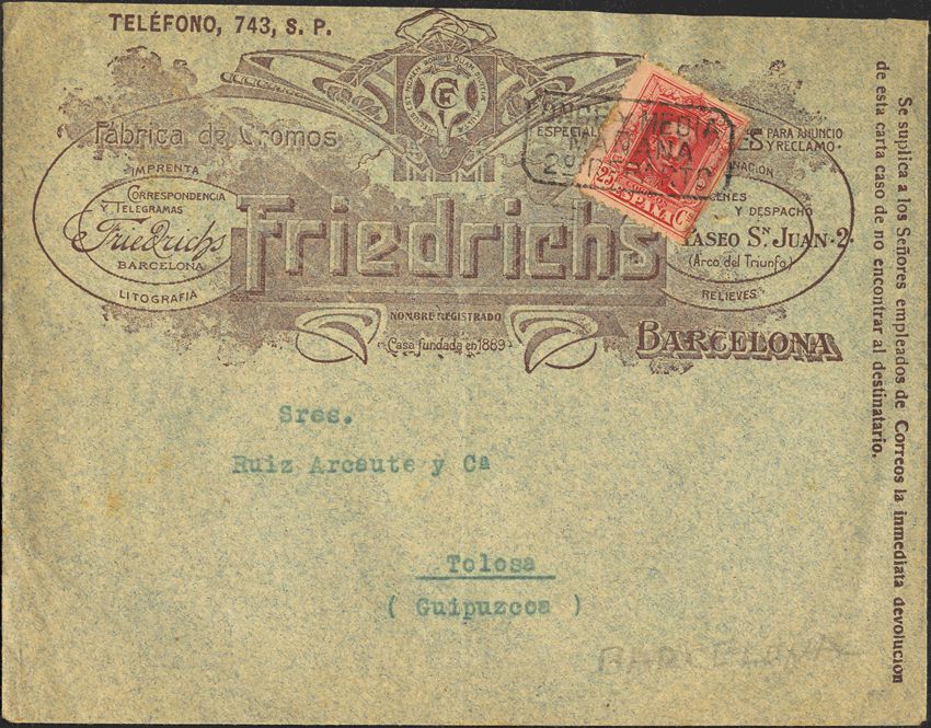 317. 1925. 25 cts. carmín. Sobre Comercial Ilustrado de BARCELONA a TOLOSA. Matasello ONCE Y MEDIA / MAÑANA / 2º REPARTO. MAGNIFICA.