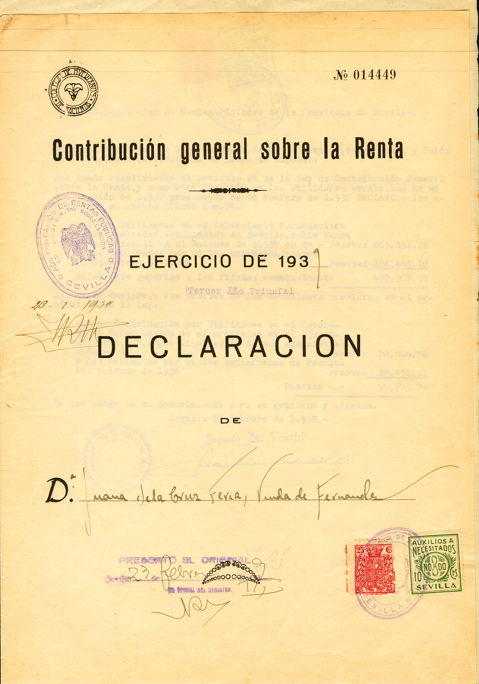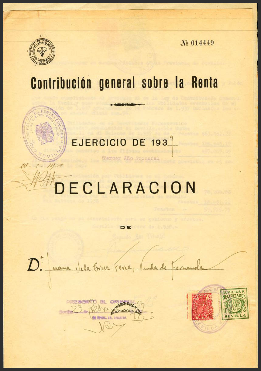 91. 1939. 25 cts carmÃn y 10 cts verde benéfico de Sevilla. Declaración de la Renta de 1939. Matasello ADMINISTRACION DE RENTAS PUBLICAS / SEVILLA, en violeta. MAGNIFICO.