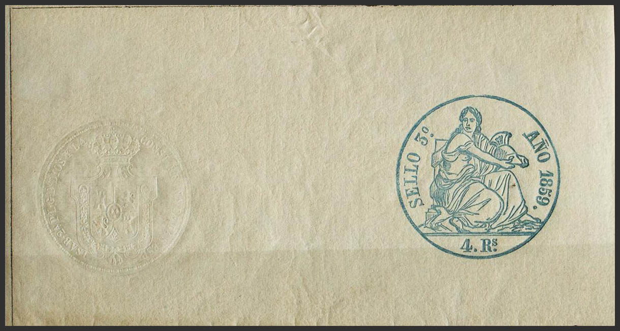 ★1858. POLIZAS de 1859. 4 reales azul, completo con sello en seco. MAGNIFICO Y MUY RARO. (Alemany 14)