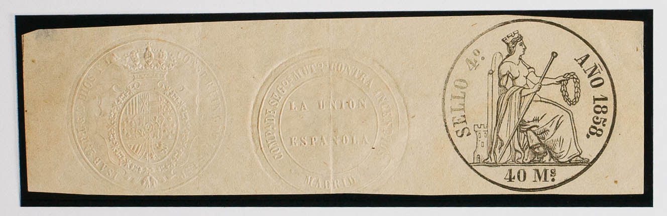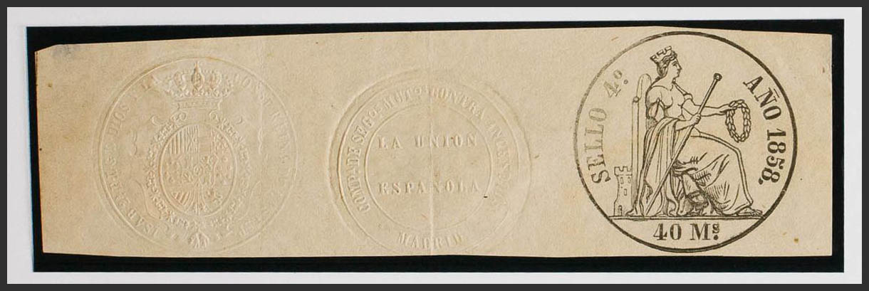 (★)1858. POLIZAS de 1858. 40 ms negro, con doble sello en seco, uno particular (formato reducido). MAGNIFICO Y MUY RARO.