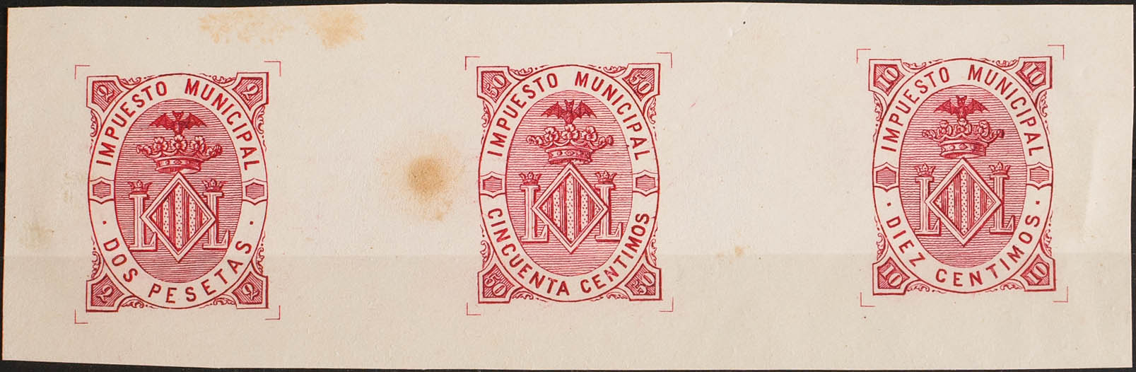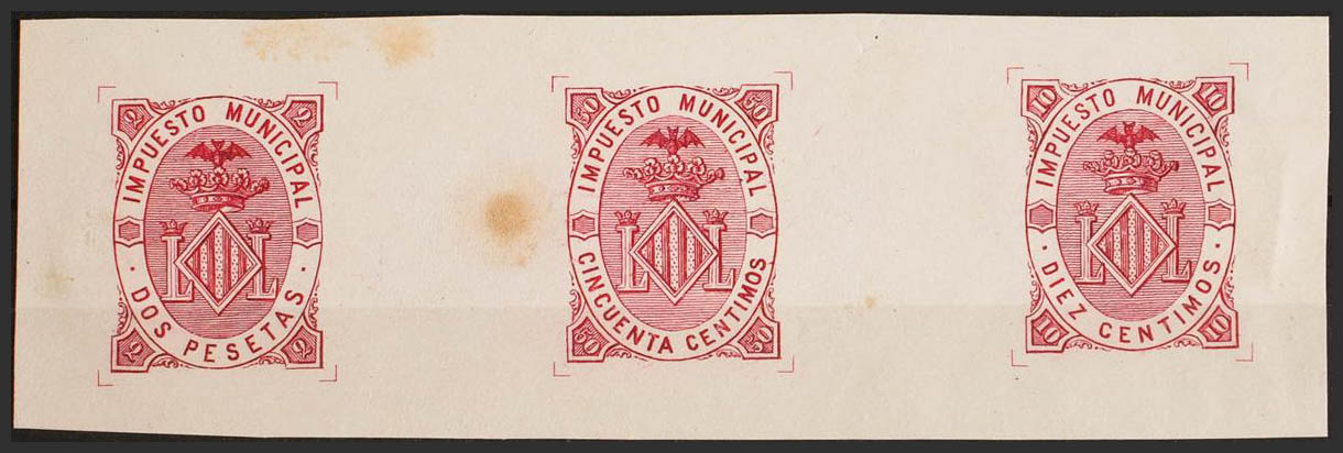 (★)1882. VALENCIA de 1882. IMPUESTO MUNICIPAL. 10 cts carmín, 50 cts carmín y 2 pts carmín (manchitas de humedad sin importancia), sobre PRUEBA DE PUNZON con los tres valores sobre cartulina gruesa. MAGNIFICO Y MUY RARO. (Forbin 1/3)