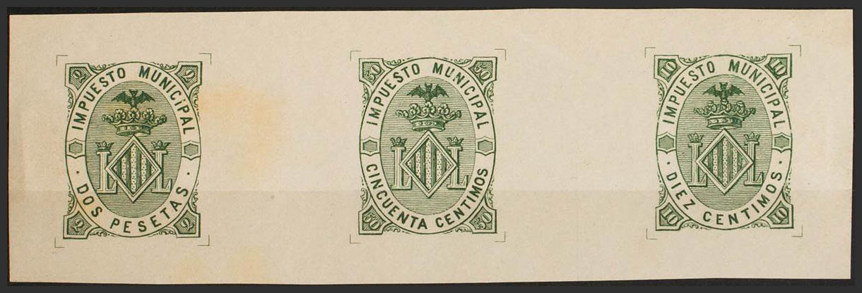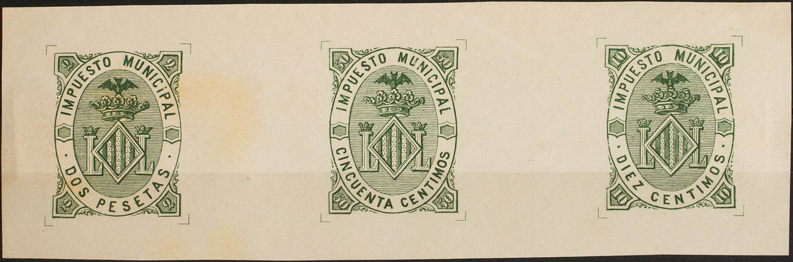 (★)1882. VALENCIA de 1882. IMPUESTO MUNICIPAL. 10 cts verde, 50 cts verde y 2 pts verde (manchitas de humedad sin importancia), sobre PRUEBA DE PUNZON con los tres valores sobre cartulina gruesa. MAGNIFICO Y MUY RARO. (Forbin 1/3)