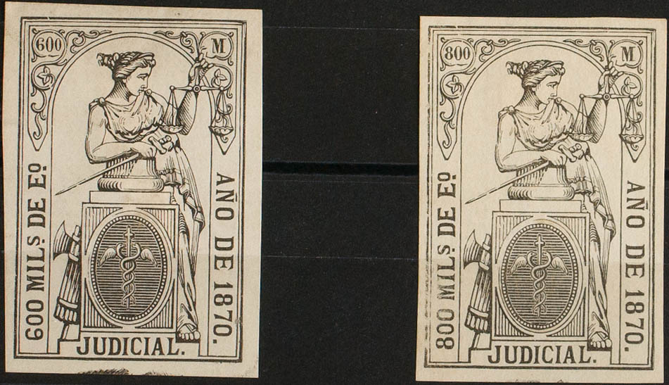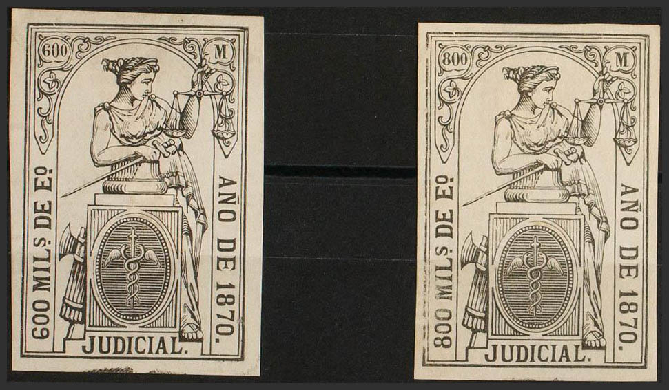 (★)1870. POLIZAS de 1870. 600 mils negro y 800 mils negro (tipo Justicia con leyenda JUDICIAL). MAGNIFICOS Y MUY RAROS, NO RESEÑADOS.