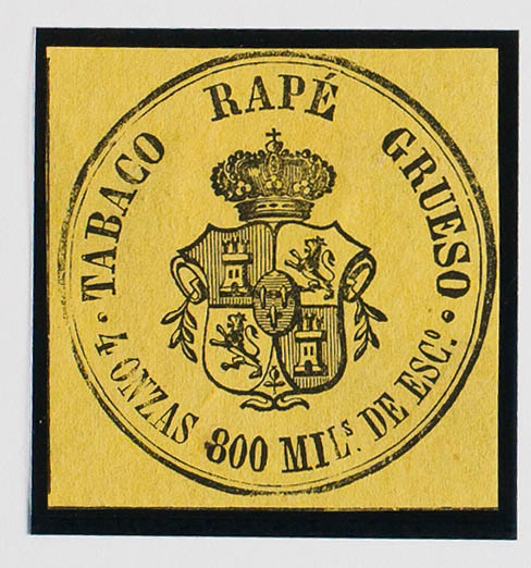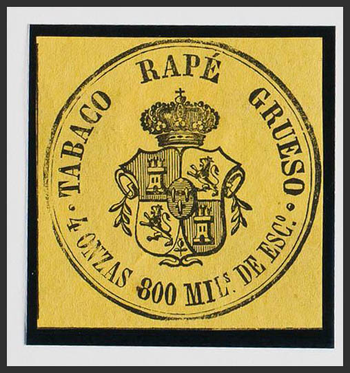 (★)(1867ca). IMPUESTO DEL TABACO de (1867ca). 800 mils negro sobre amarillo. TABACO RAPE GRUESO. MAGNIFICO Y MUY RARO, NO RESEÑADO.