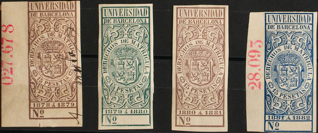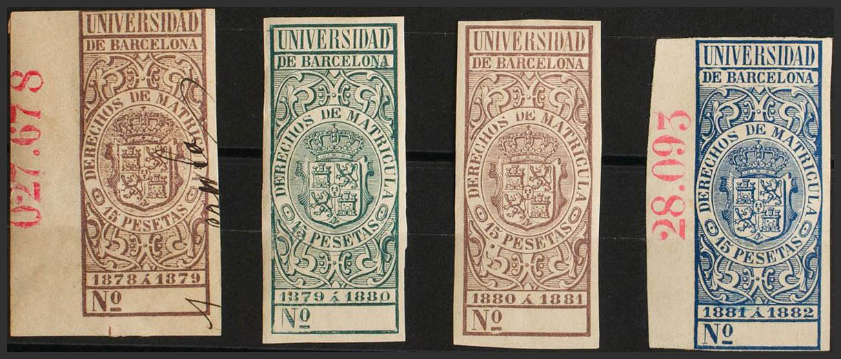 ★/1878. DERECHOS DE MATRICULAS de 1878. 15 pts castaño (uso fiscal), 15 pts verde, 15 pts lila y 15 pts azul. UNIVERSIDAD DE BARCELONA. MAGNIFICOS. (Alemany 2/5)
