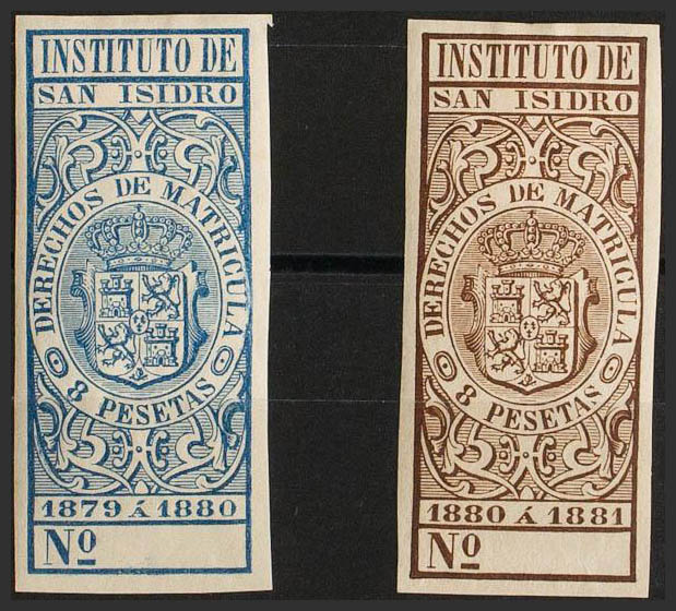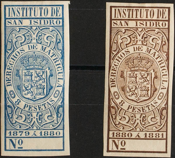 ★1879. DERECHOS DE MATRICULAS de 1879. 8 pts azul y 8 pts castaño. INSTITUTO DE SAN ISIDRO. MAGNIFICOS. (Alemany 58, 59)