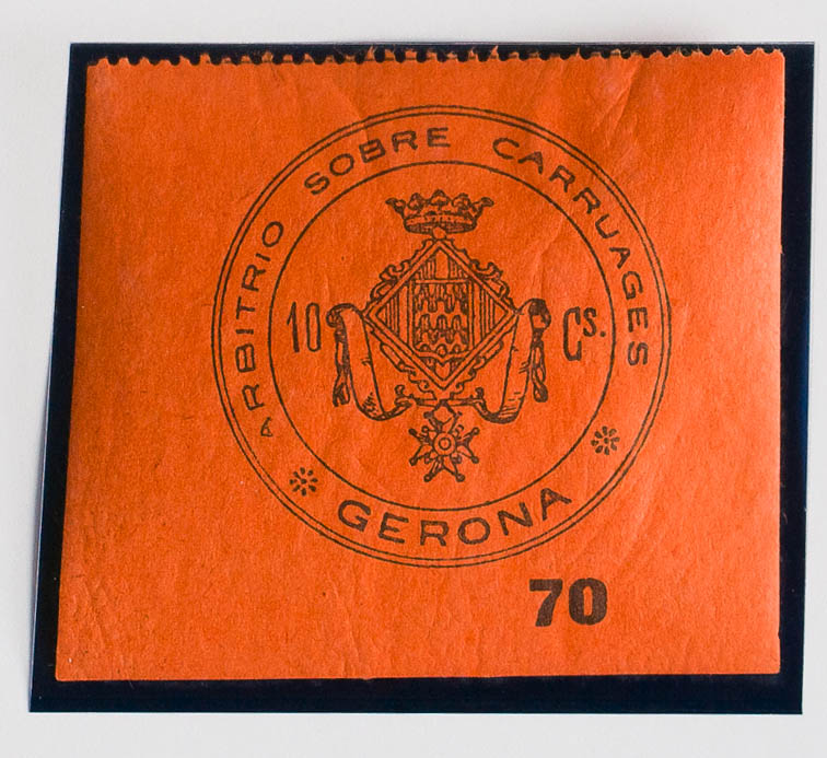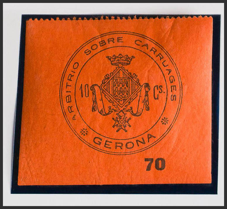 ★(1886ca). GERONA de (1886ca). IMPUESTO MUNICIPAL. 10 cts negro sobre rojo. ARBITRIO SOBRE CARRUAGES. MAGNIFICO Y MUY RARO, NO RESEÑADO.