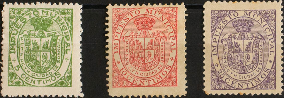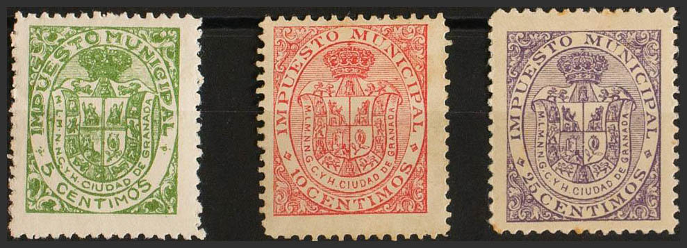 ★1899. GRANADA de 1899. IMPUESTO MUNICIPAL. Serie completa, tres valores. MAGNIFICA MUY RARA. (Forbin 5/7)