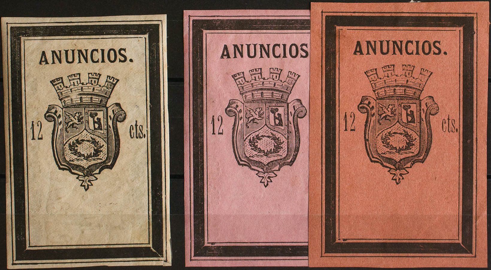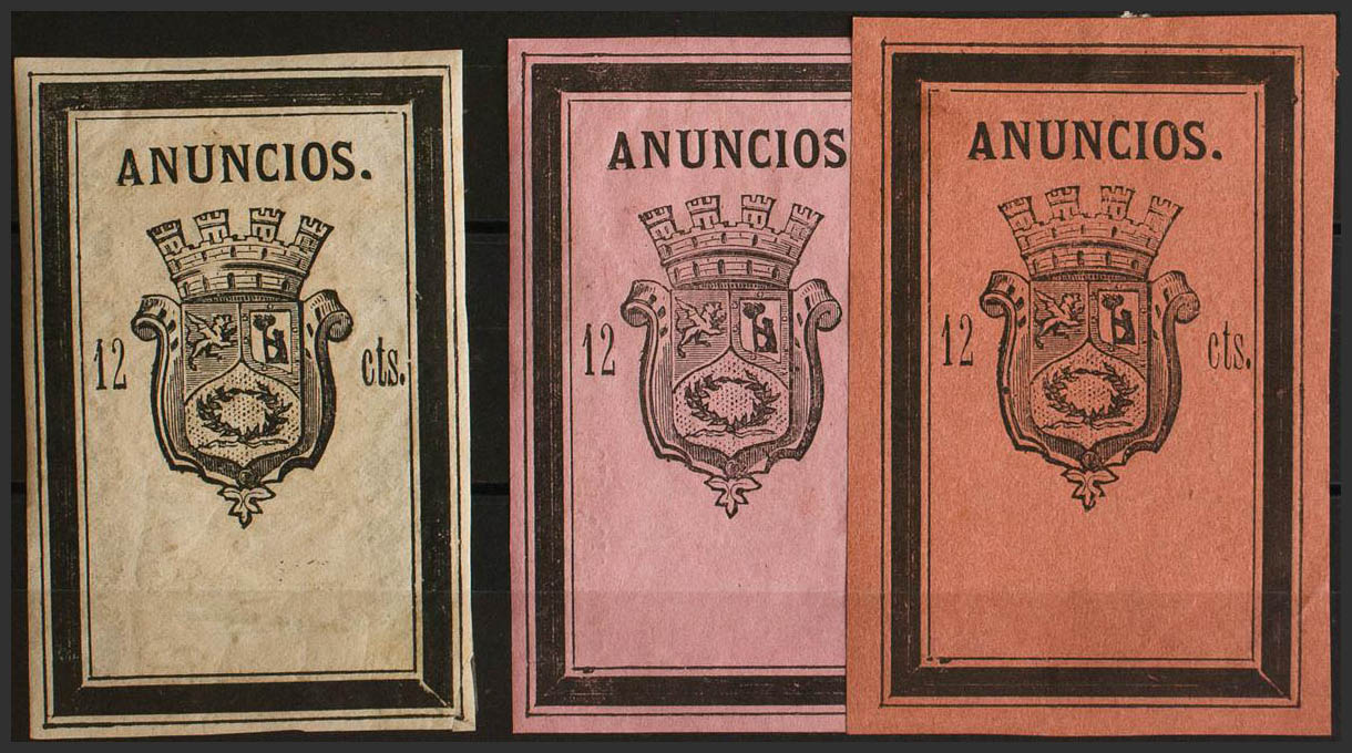 ★1874. MADRID de 1874. IMPUESTO MUNICIPAL. 12 cts negro sobre blanco, 12 cts negro sobre violeta y 12 cts negro sobre rosa oscuro. MAGNIFICOS Y MUY RAROS EN NUEVOS, MUY ESPECTACULARES. (Forbin 4, 7, 8)