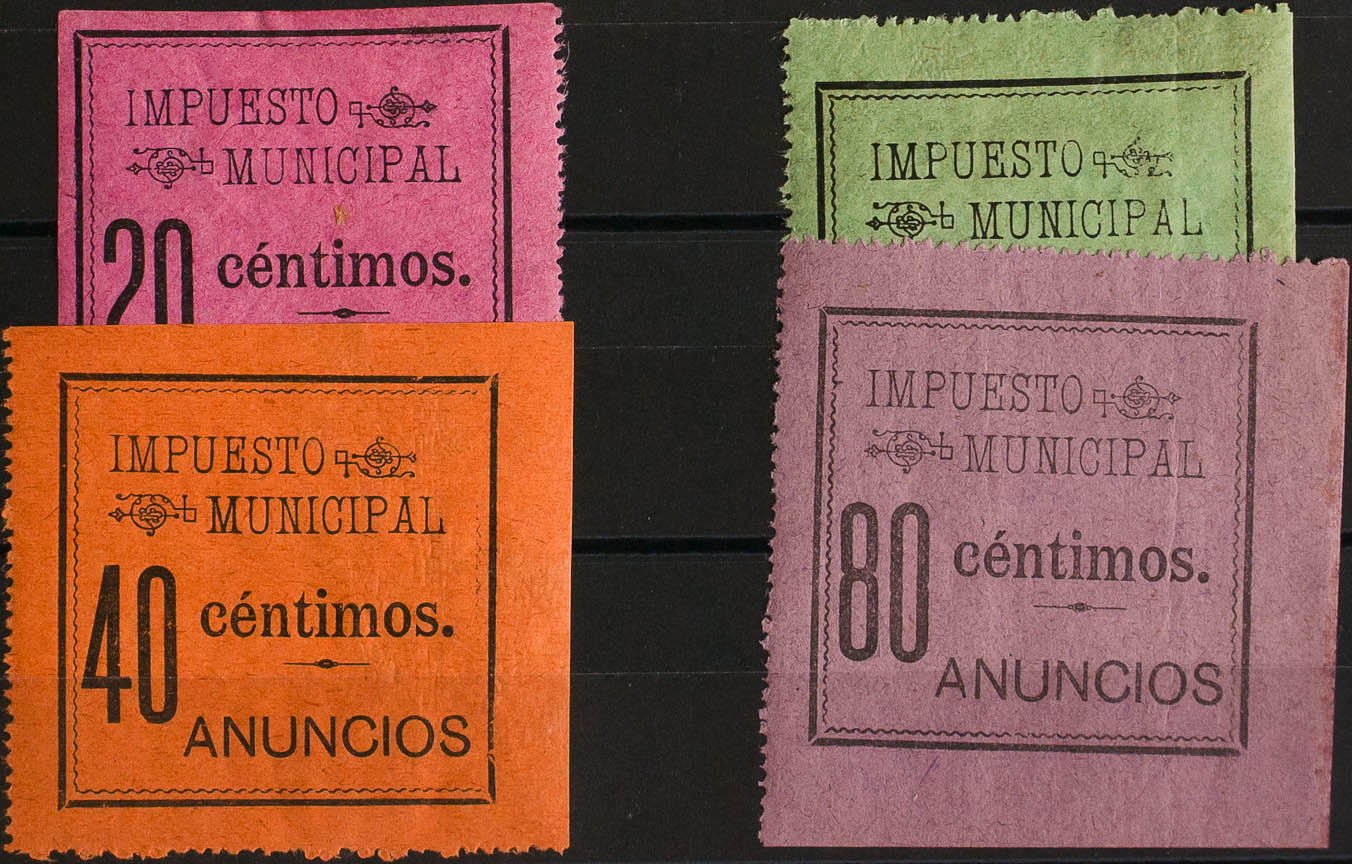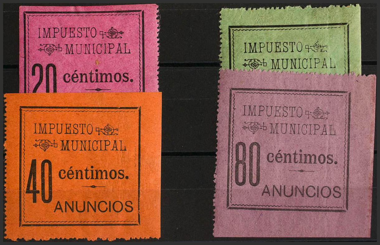 ★1899. MADRID de 1899. IMPUESTO MUNICIPAL. Serie completa, a falta del 15 cts (en el catálogo Forbin aparece con un interrogante). ANUNCIOS. MAGNIFICA Y RARA. (Forbin 51/54)