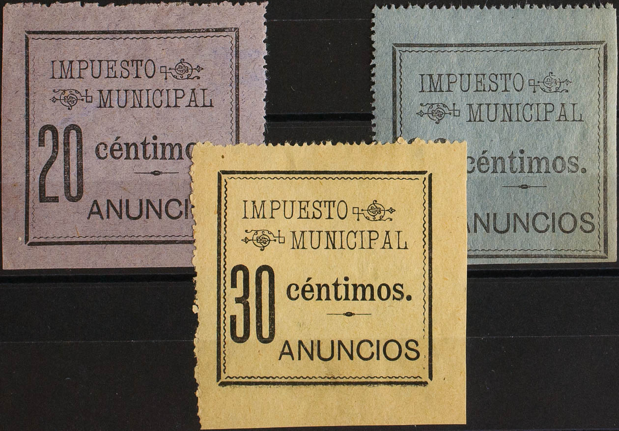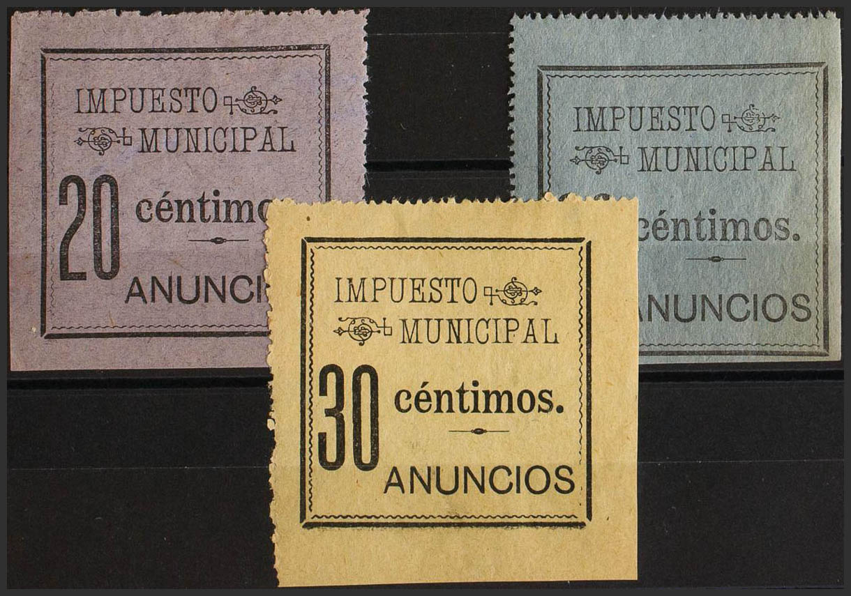 ★/(★)1900. MADRID de 1900. IMPUESTO MUNICIPAL. 20 cts negro sobre lila, 30 cts negro sobre azul y 30 cts negro sobre amarillo. ANUNCIOS. MAGNIFICOS. (Forbin 55/56, 57)