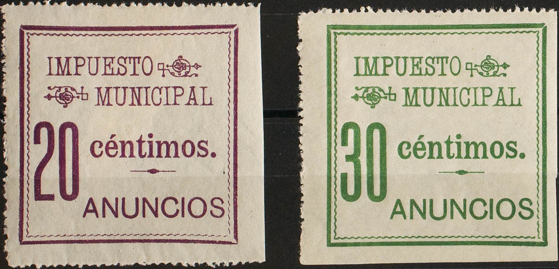 ★1905. MAADRID de 1905. IMPUESTO MUNICIPAL. 20 cts violeta y 30 cts verde. ANUNCIOS. MAGNIFICOS. (Forbin 64/65)