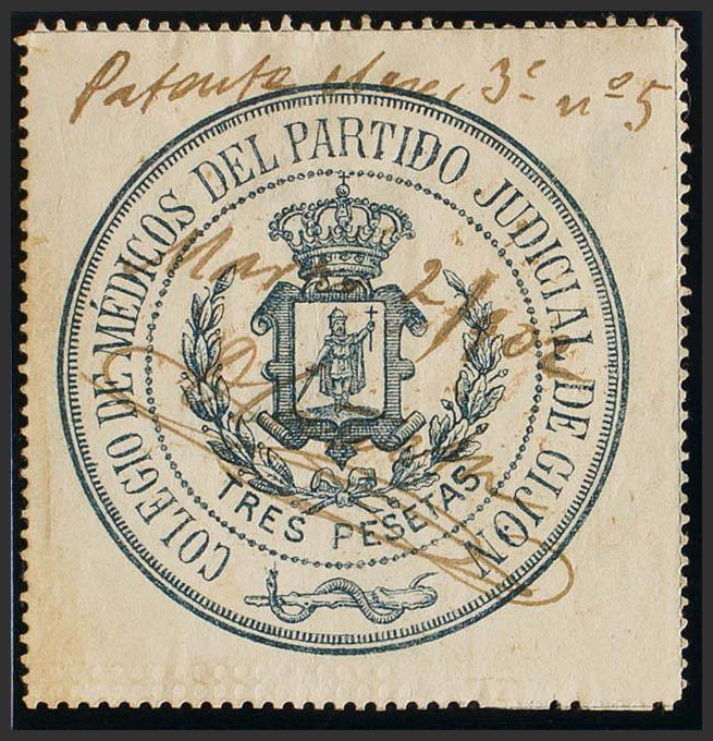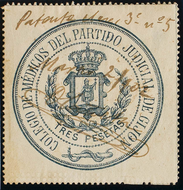 1902. GIJON. COLEGIO DE MEDICOS de 1902. 3 pts azul. COLEGIO DE MEDICOS DEL PARTIDO JUDICIAL DE GIJON. MAGNIFICO Y RARO.