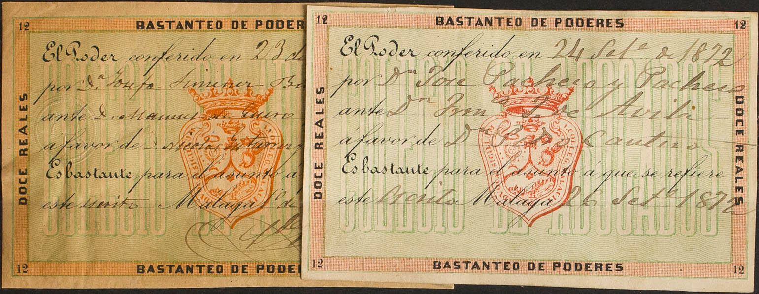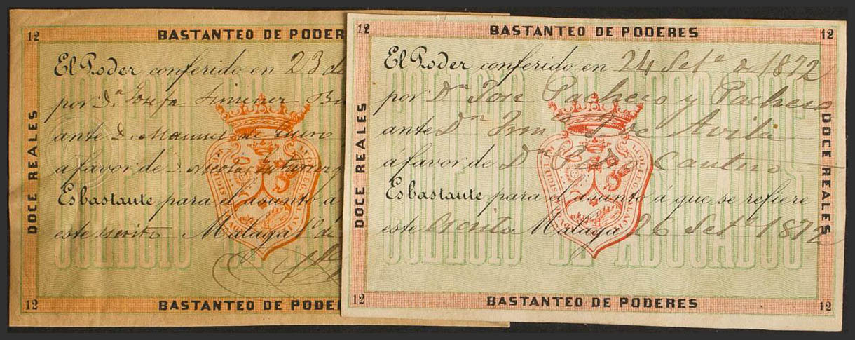 1864. MALAGA. NOTARIA de 1864. 12 reales naranja y verde y 12 reales rosa y verde. Etiquetas de BASTANTEO DE PODERES. MAGNIFICAS Y RARAS.