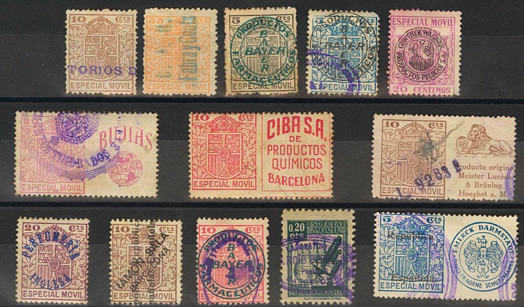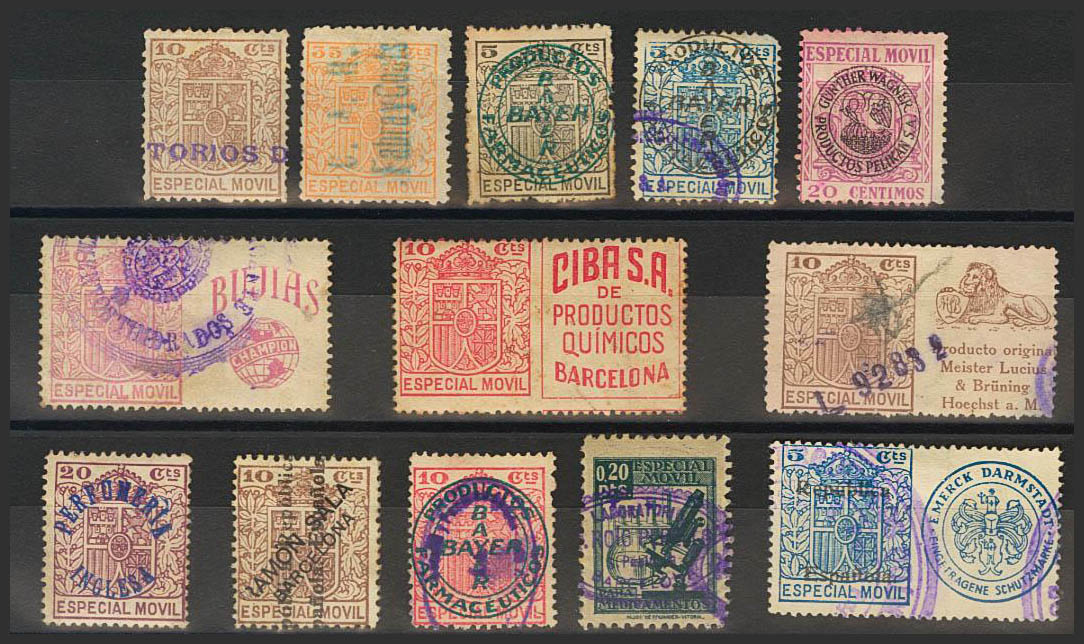 (★)/(1923ca). ESPECIAL MOVIL PUBLICITARIO de (1923ca). Conjunto de veinticinco sellos de diferentes valores con diversas sobrecargas publicitarias, cuatro con bandeleta. MAGNIFICO Y RARO CONJUNTO.