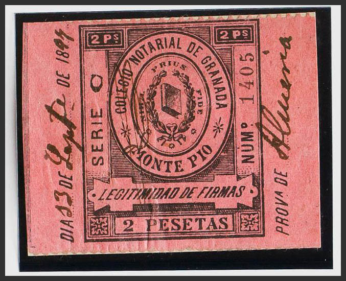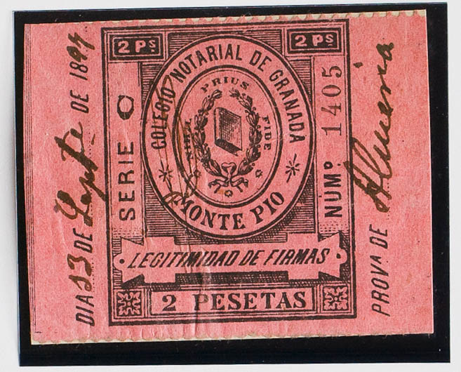 1897. GRANADA. NOTARIAS de 1897. 2 pts negro sobre rosa. LEGITIMIDAD DE FIRMAS. MAGNIFICO Y RARO. (Fulcher 1695)