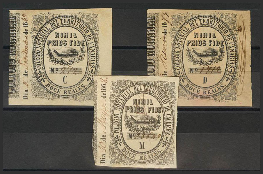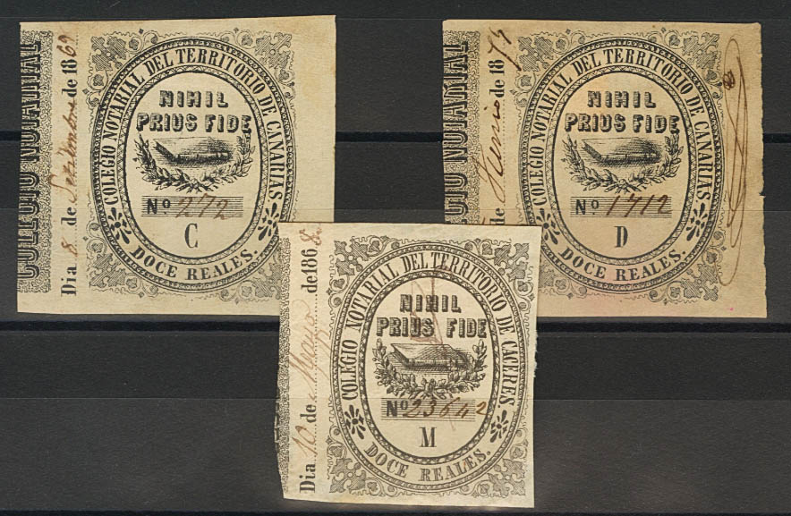 1868. CANARIAS. NOTARIAS de 1868. 12 reales negro, tres fiscales (Series C, D y M). MAGNIFICOS Y RAROS. (Fulcher 1659)