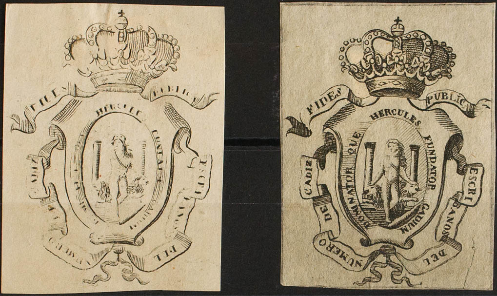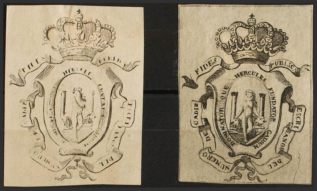 (★)(1860ca). CADIZ. COLEGIO DE ESCRIBANOS de (1860ca). Sin valor, negro, dos fiscales con diferentes tonalidades. ESCRIBANOS DEL NUMERO DE CADIZ. MAGNIFICO Y RARO.