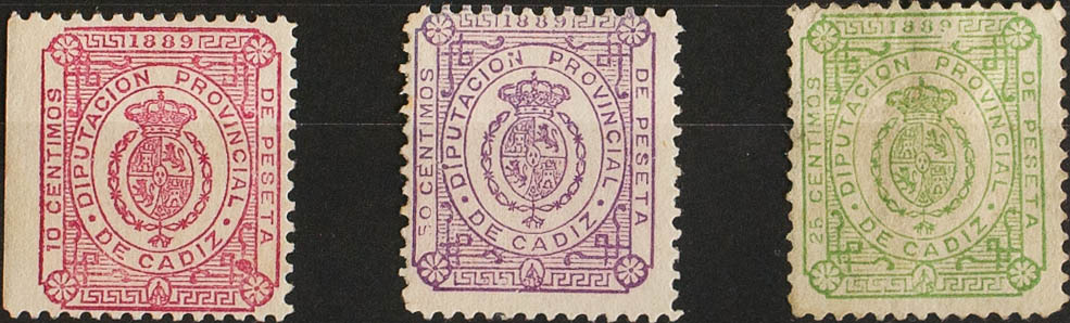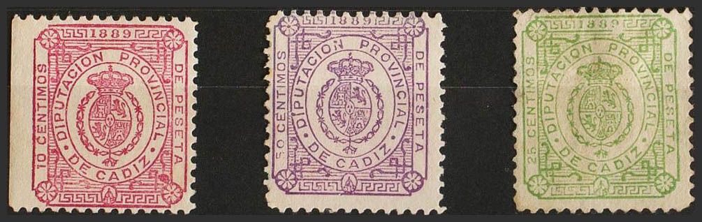 (★)1889. CADIZ. DIPUTACION PROVINCIAL de 1889. Serie completa, tres valores. MAGNIFICA. (Forbin 1/3)