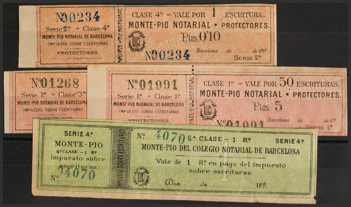 ★(1890ca). BARCELONA. NOTARIAS de (1890ca). 10 cts negro sobre naranja, 50 cts negro sobre naranja, 5 pts negro sobre rosa y 1 real negro sobre verde. MONTEPIO DEL COLEGIO NOTARIAL DE BARCELONA. ESCRITURAS. MAGNIFICOS Y RAROS CON BANDELETA.