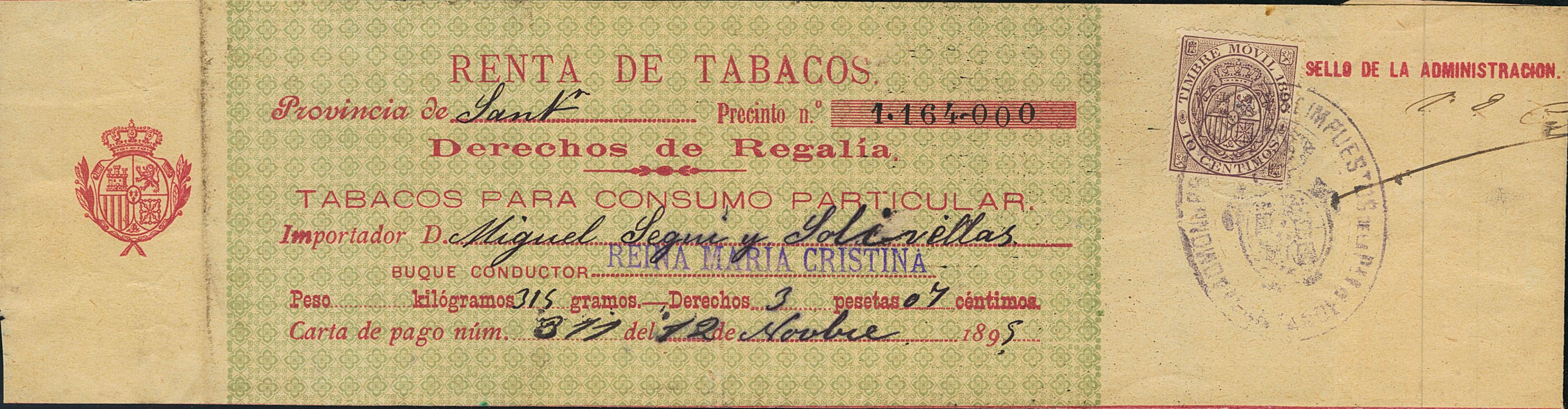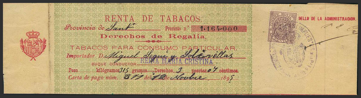 1895. IMPUESTO DEL TABACO de 1895. Timbre Móvil de 10 cts violeta sobre banda completa de TABACOS PARA CONSUMO PARTICULAR / DERECHOS DE REGALIA. MAGNIFICA Y RARISIMA.
