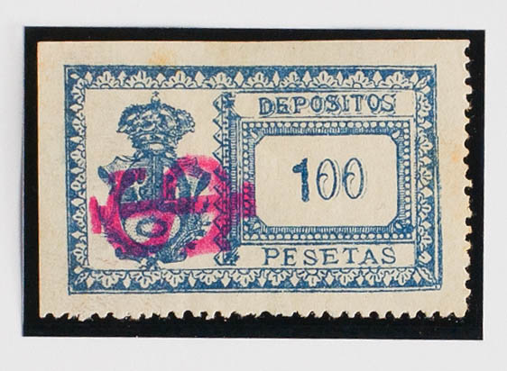 (★)1901. MADRID. DEPOSITOS de 1901. 100 pts azul (sobrecarga IS, en carmÃn). MAGNIFICO Y MUY RARO. (Forbin 74)